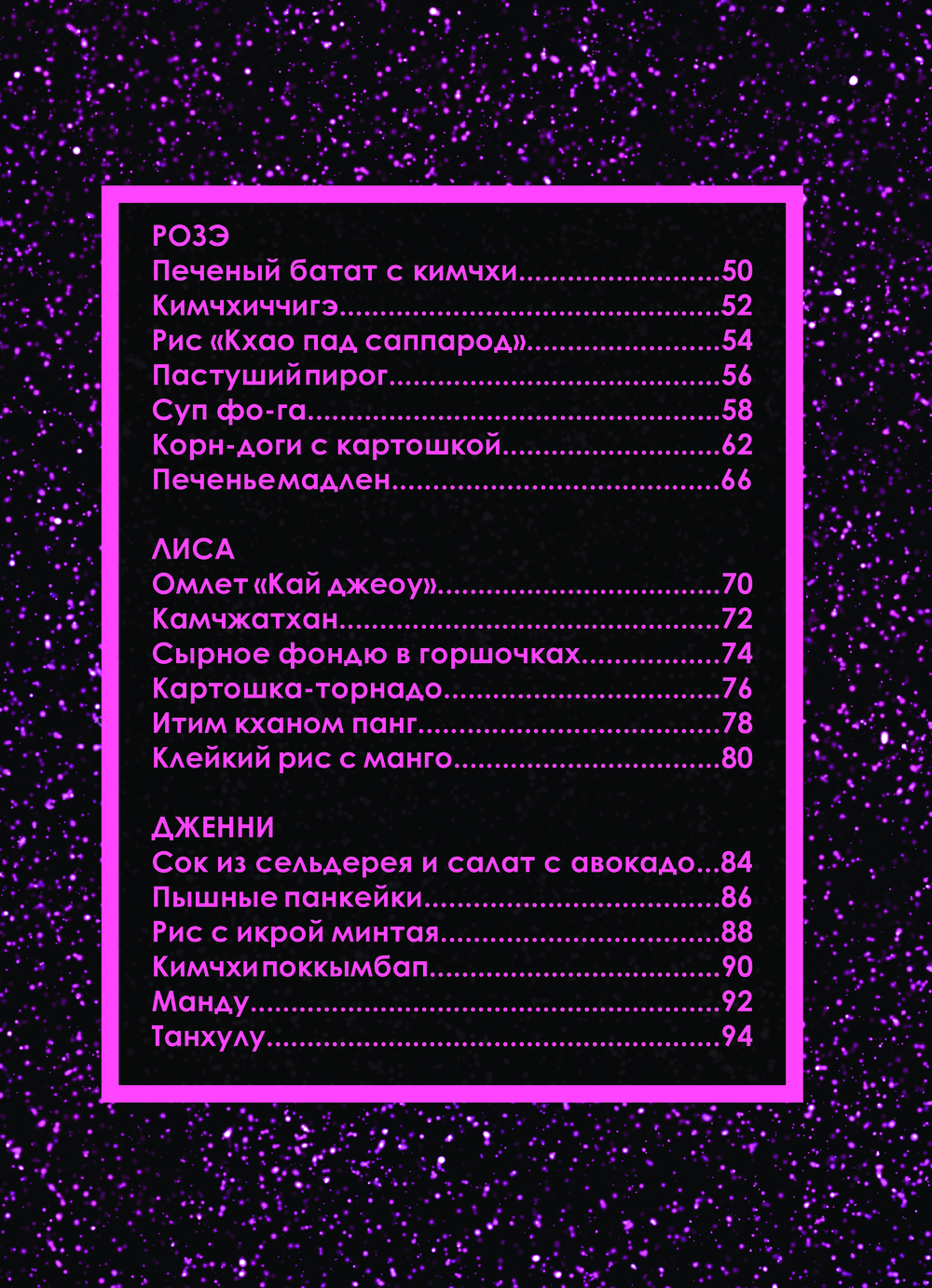 Вас ждет 30 ярких рецептов, которые обожают Джису, Розэ, Дженни и Лиса: то, что вы видели на трансляциях, в шоу и соцсетях; то, что они готовили вместе, заказывали среди ночи или делали на завтрак.