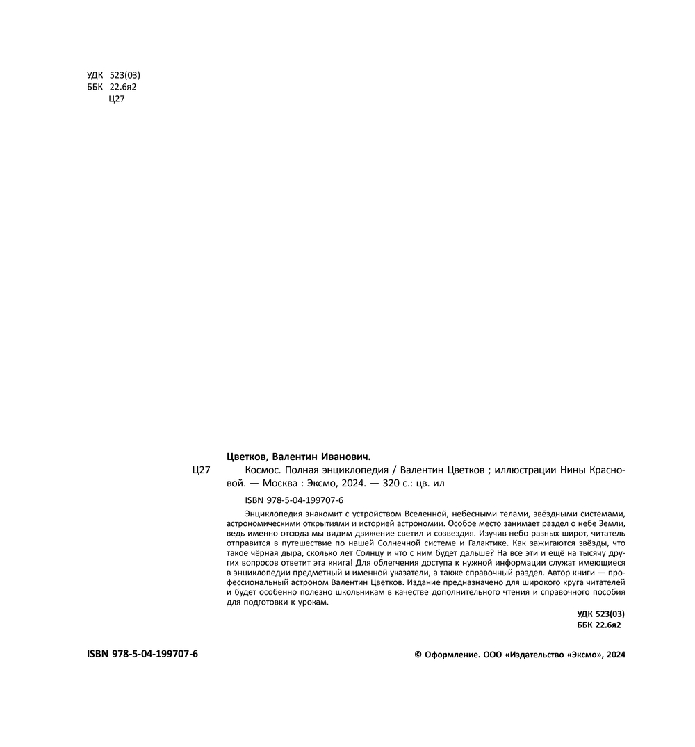 В этой полной энциклопедии есть всё, что необходимо знать о Вселенной, её происхождении и устройстве! Самые увлекательные и полезные факты о космосе, история и развитие астрономии, подробное описание каждой планеты Солнечной системы, полезные советы по наблюдению за звёздным небом, занимательные данные об астрономических открытиях – и всё это в одной книге. Информация в книге подана захватывающе и разнообразно, поэтому привлечёт интерес как любого подростка, так и взрослого человека. Автор книги – профессиональный астроном Валентин Цветков.