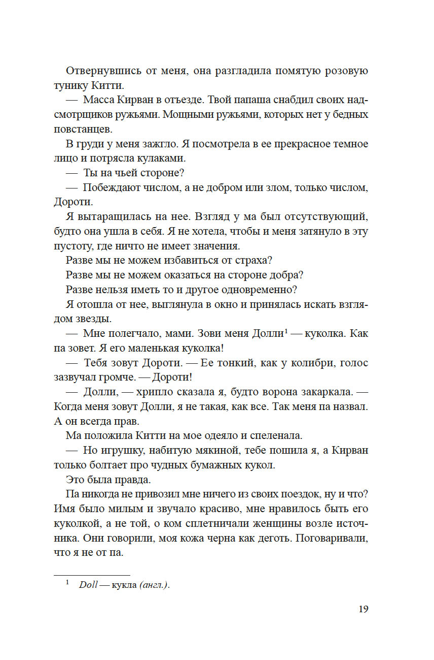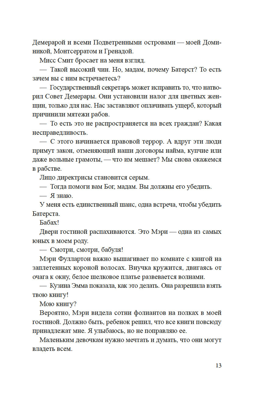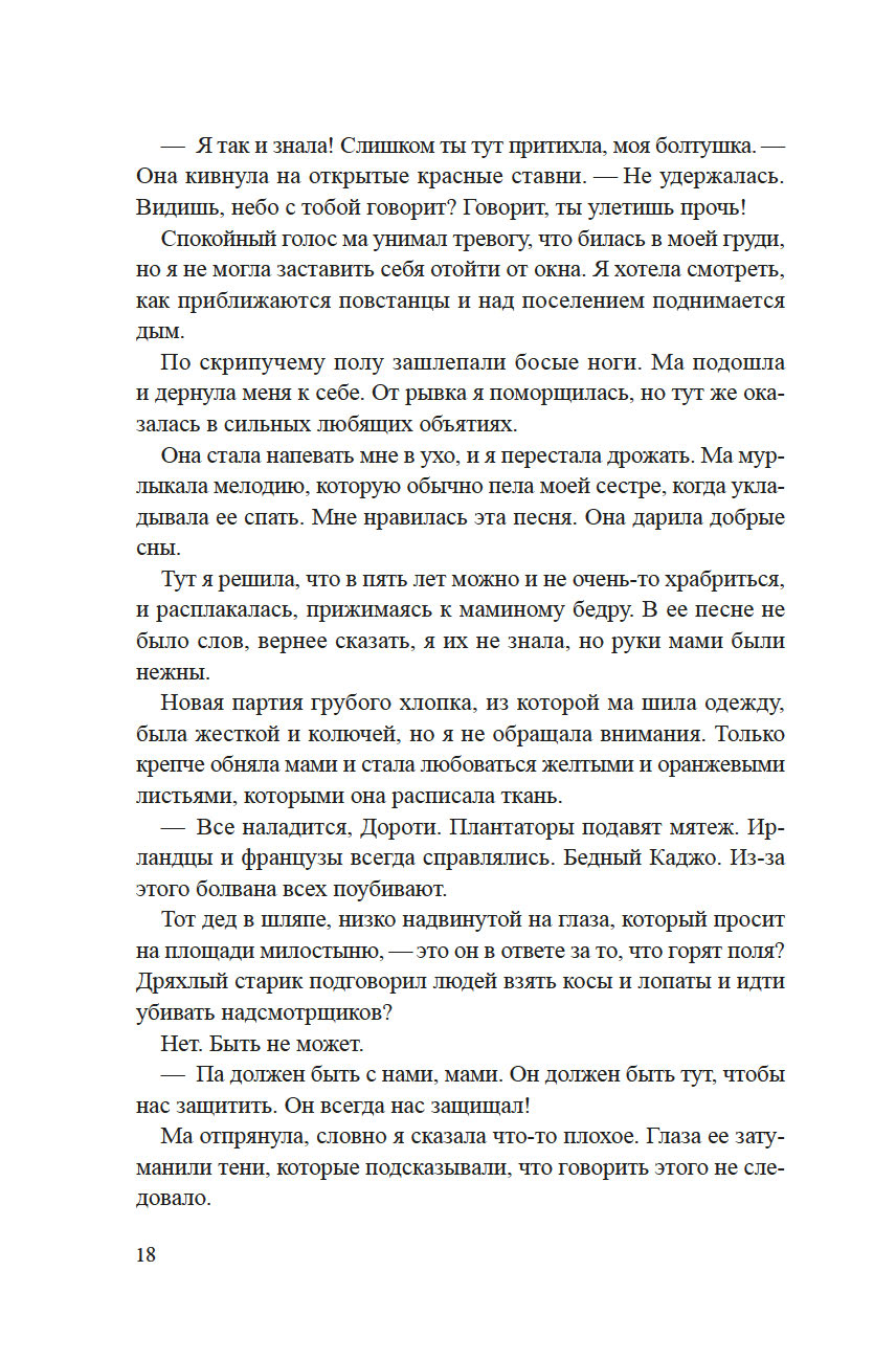 Рожденная в рабстве на крошечном карибском острове Монтсеррат, Дороти Кирван сумела выкупить свободу у своего отца – ирландского плантатора, а потом добилась освобождения сестры и матери. Ценой невероятных усилий ей удалось стать богатой и влиятельной женщиной, владелицей домов и земель, от сахарных плантаций Доминики и Барбадоса до роскошного отеля в Демераре на южноамериканском континенте. Это рассказ о реальной исторической фигуре – женщине, сумевшей пробить себе путь наверх в чудовищных условиях рабства и колониализма, женщине, не боявшейся любить и не останавливавшейся ни перед чем ради любимых.
