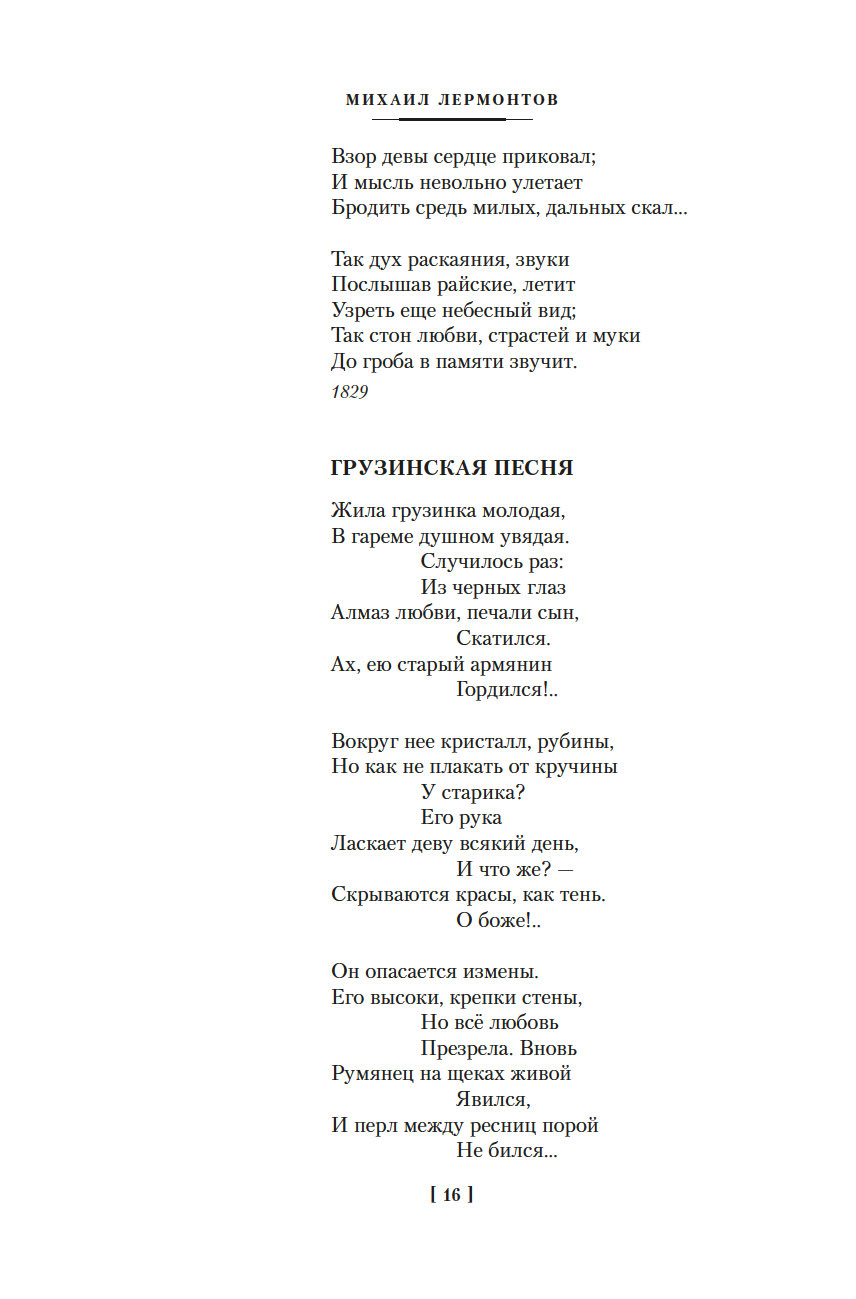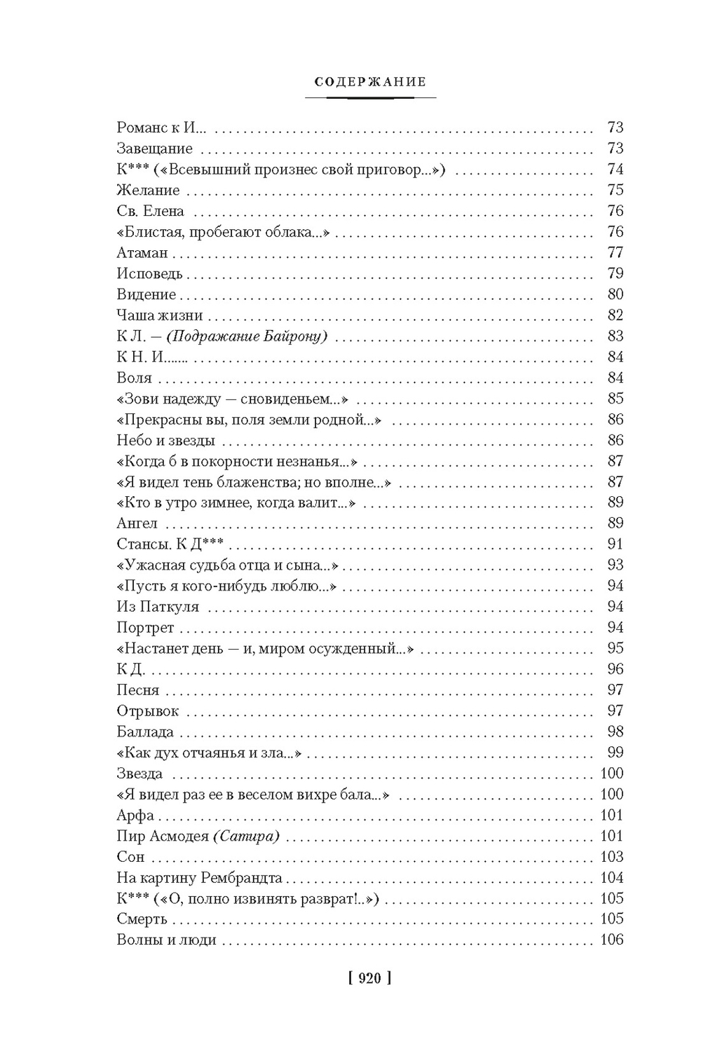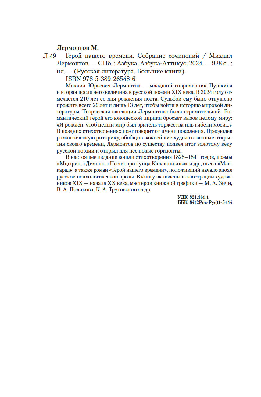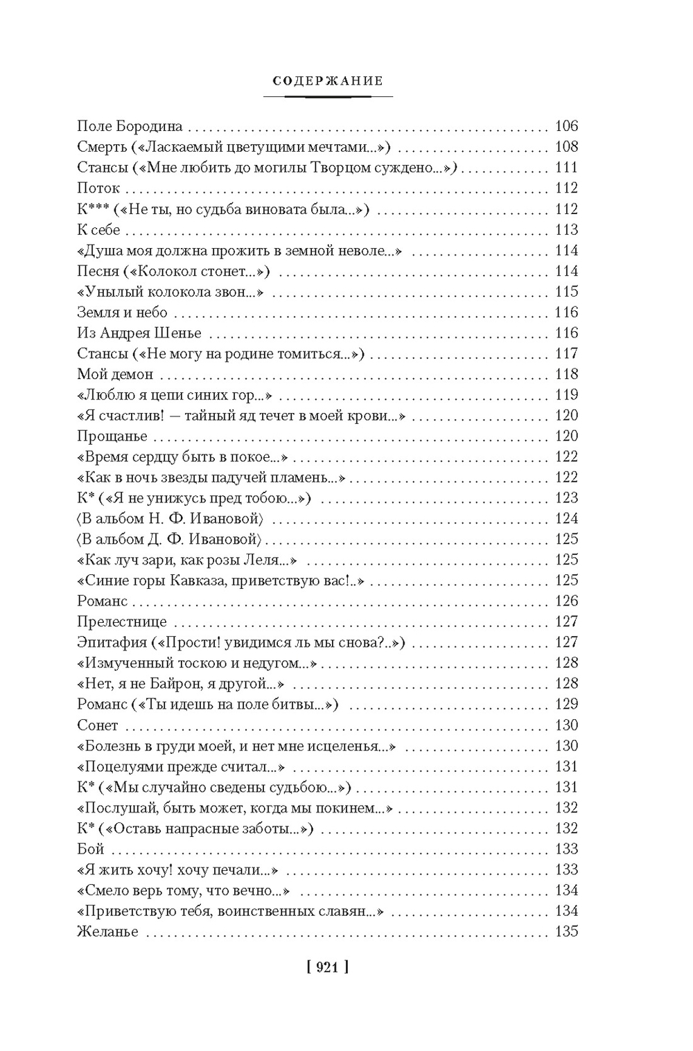 В настоящее издание вошли стихотворения 1828-1841 годов, поэмы "Мцыри", "Демон", "Песня про купца Калашникова" и др., пьеса "Маскарад", а также роман "Герой нашего времени", положивший начало эпохе русской психологической прозы. В книгу включены иллюстрации художников XIX – начала ХХ века, мастеров книжной графики – М. А. Зичи, В. А. Полякова, К. А. Трутовского и др.