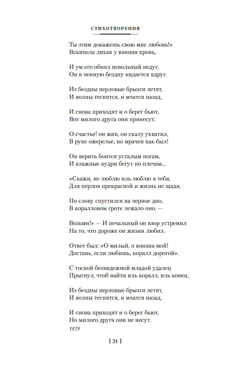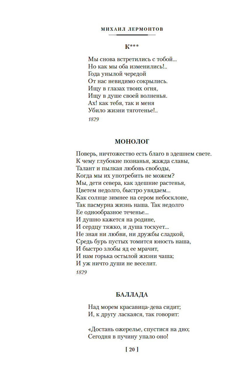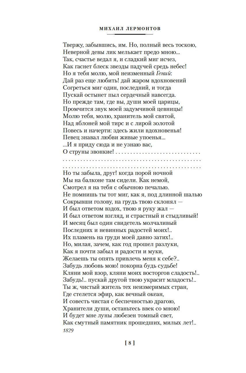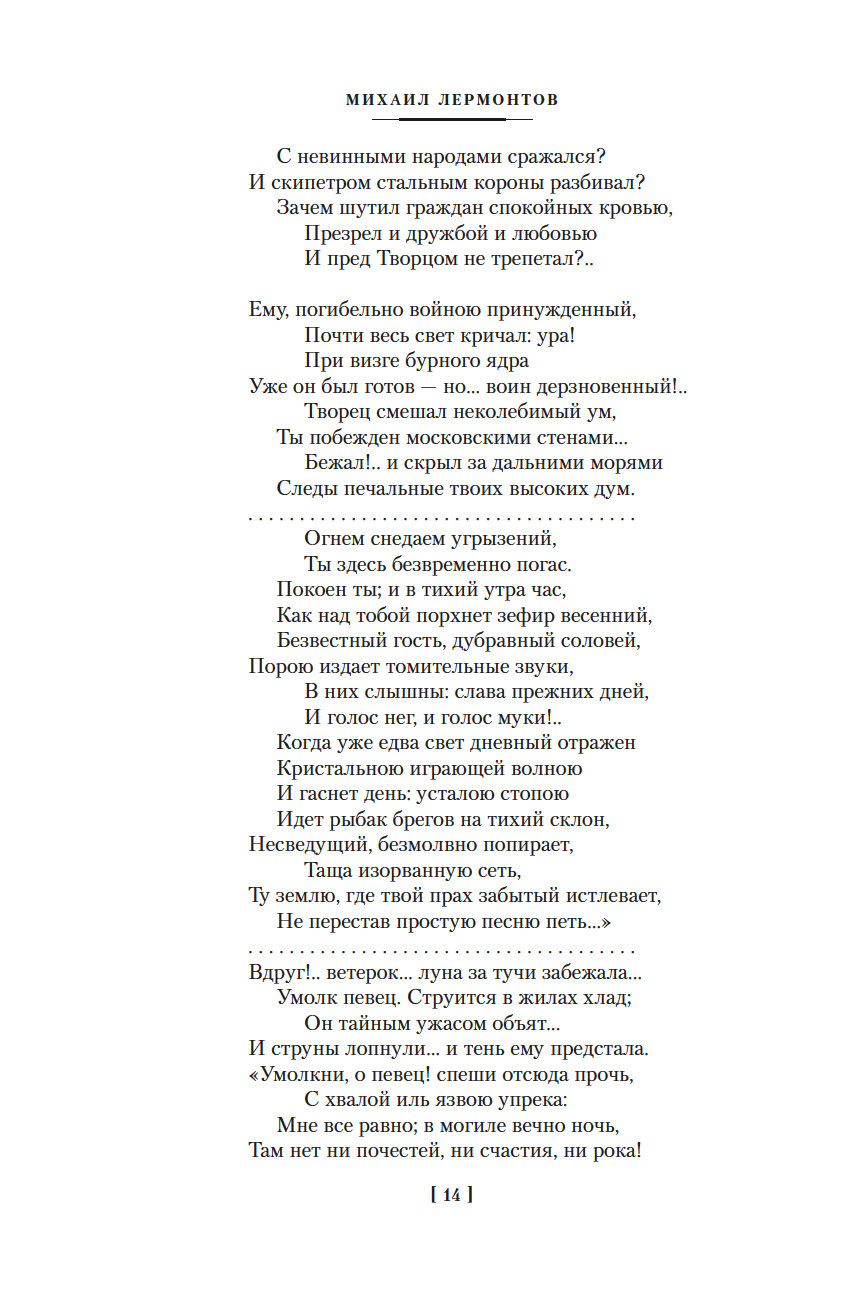 В настоящее издание вошли стихотворения 1828-1841 годов, поэмы "Мцыри", "Демон", "Песня про купца Калашникова" и др., пьеса "Маскарад", а также роман "Герой нашего времени", положивший начало эпохе русской психологической прозы. В книгу включены иллюстрации художников XIX – начала ХХ века, мастеров книжной графики – М. А. Зичи, В. А. Полякова, К. А. Трутовского и др.