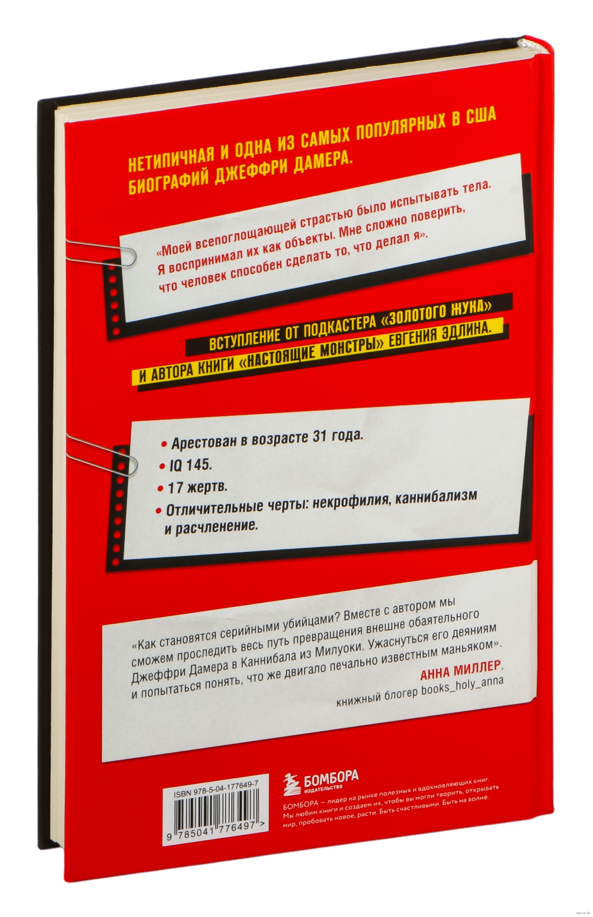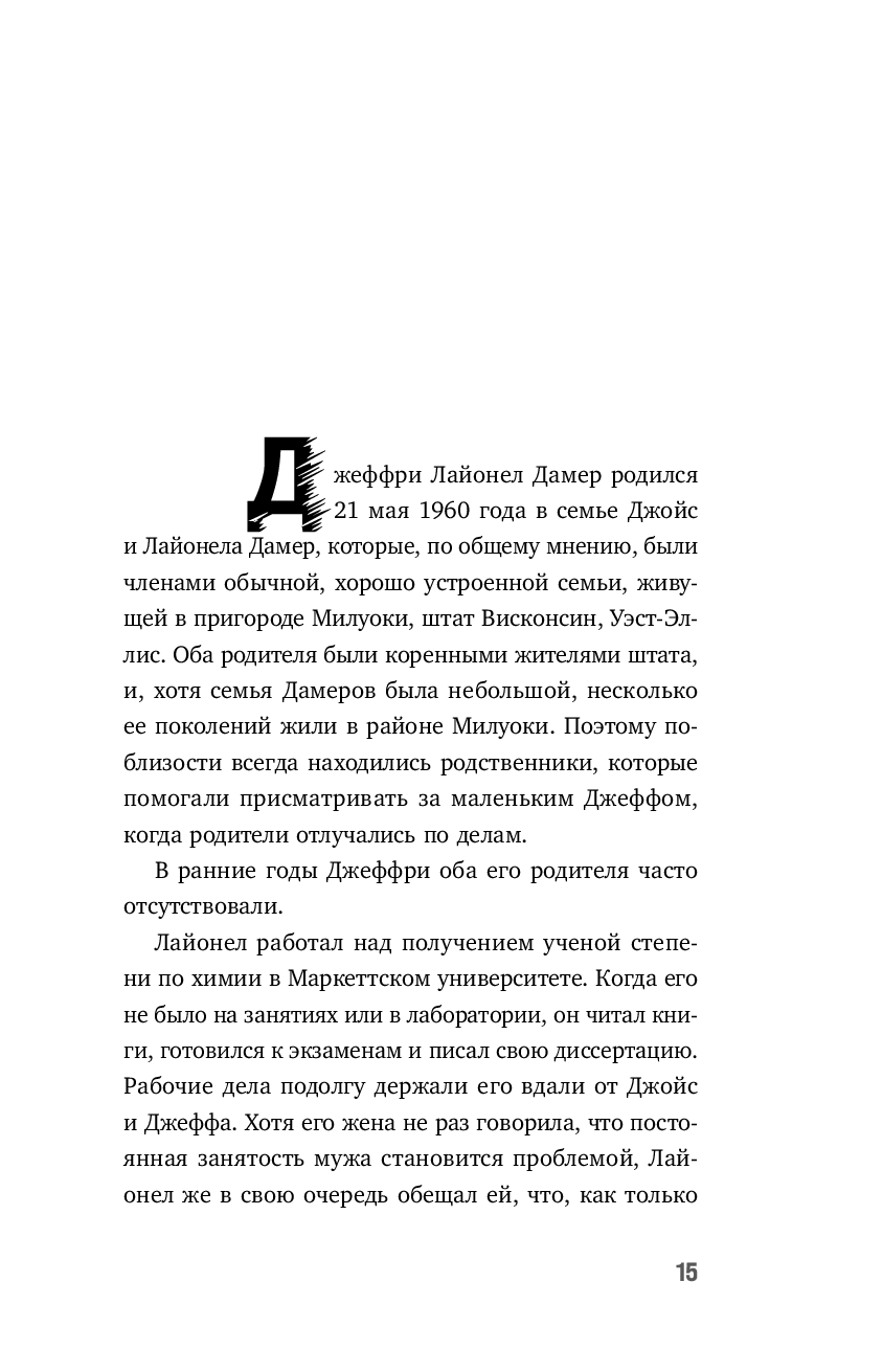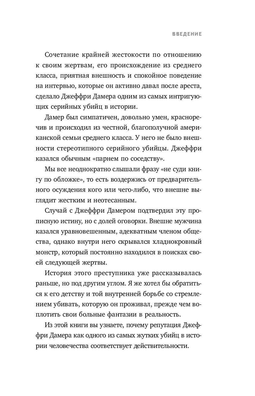 Интересная и очень увлекательная книга, в которой смешались психология и интересные факты об одном из самых известных преступников Америки. Автор плавно вводит читателя в историю Джефри с самого детства и до момента поимки, не упуская даже мелкие детали