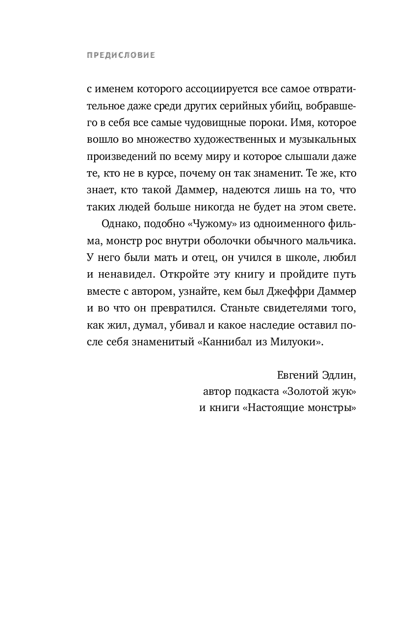 Это биография знаменитого Каннибала из Милуоки от автора "Большой книги серийных убийц". Криминальный журналист Джек Роузвуд подробно рассказал не только о преступлениях, судебном процессе и последних годах жизни знаменитого Каннибала из Милуоки, но и о причинах превращения обыкновенного школьника-весельчака в одного из самых кровожадных, жестоких и садистских серийных убийц в истории.