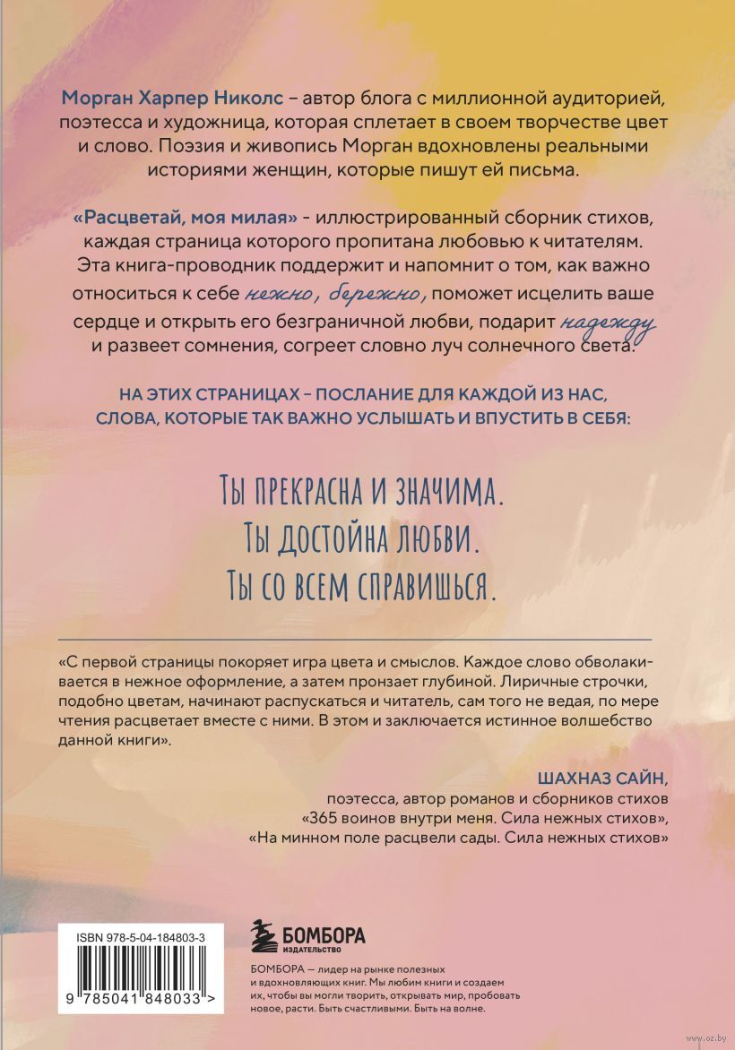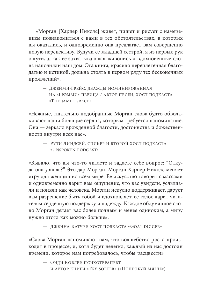 Морган Харпер Николс – поэтесса и художница, сплетающая в своем творчестве цвет и слово. В своем лирическом сборнике она мягко напоминает о ценности и богатстве жизни, и о том, что несмотря на пережитую боль, мы способны идти дальше, чтобы обрести счастье.