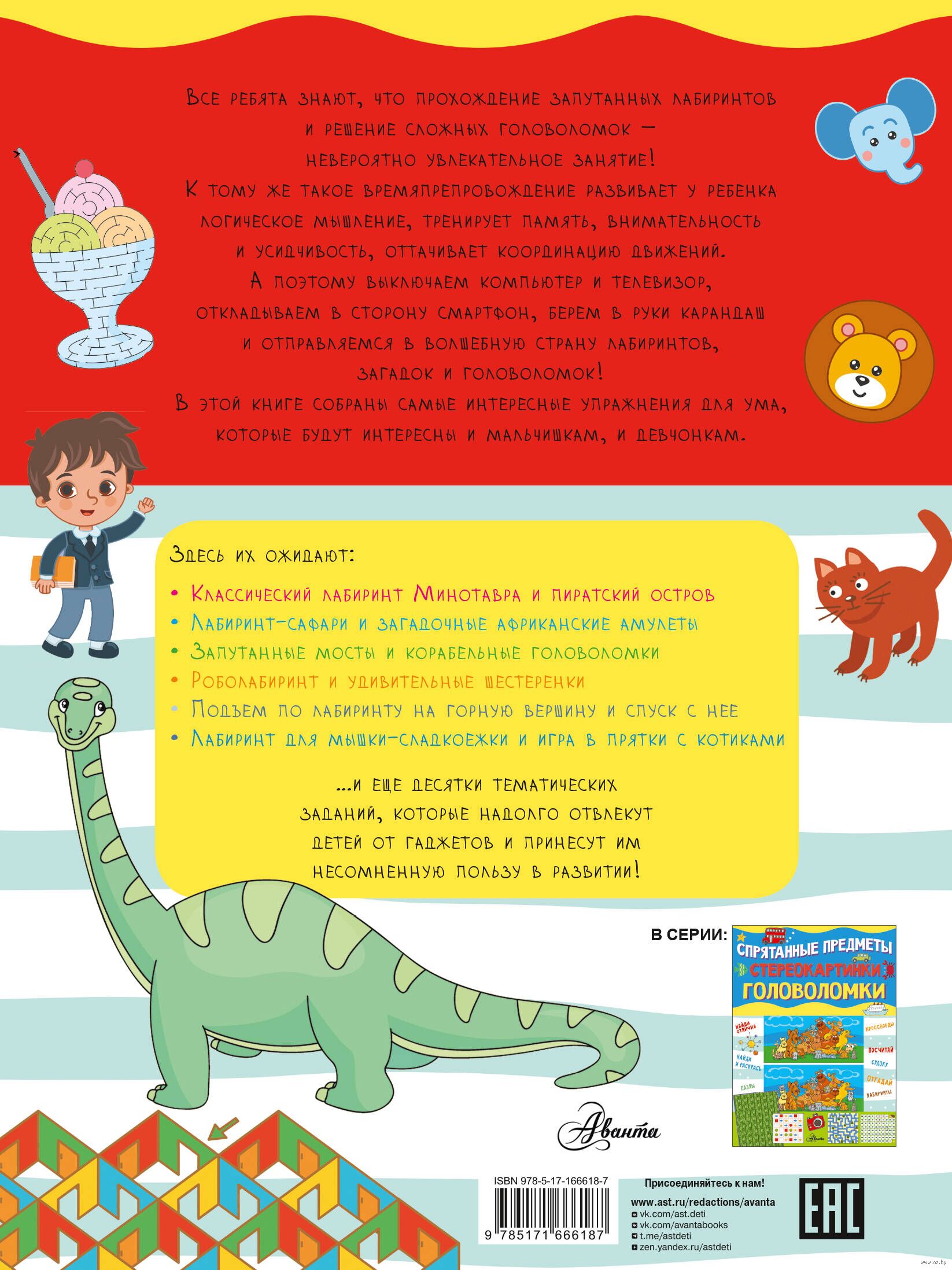 В книге собраны интересные и увлекательные лабиринты и головоломки разного уровня сложности. Вооружившись карандашом или ручкой вместо смартфона, а также терпением и любопытством, ребенок сможет заполнить свое свободное время не игровым и мультипликационным контентом, а весьма полезным развивающим занятием – прохождением лабиринтов и разгадыванием головоломок.