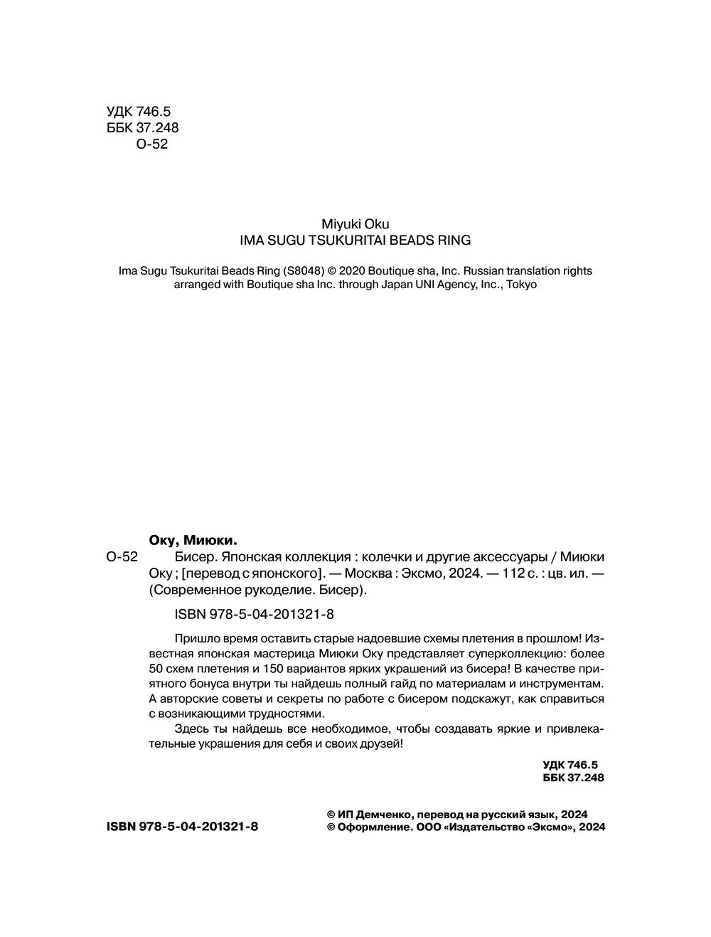 Пришло время оставить старые надоевшие схемы плетения в прошлом! Известная японская мастерица Миюки Оку представляет супер-коллекцию: более 50 схем плетения и 150 вариантов ярких украшений из бисера! В качестве приятного бонуса внутри ты найдешь полный гайд по материалам и инструментам. А авторские советы и секреты по работе с бисером подскажут как справиться с возникающими трудностями.