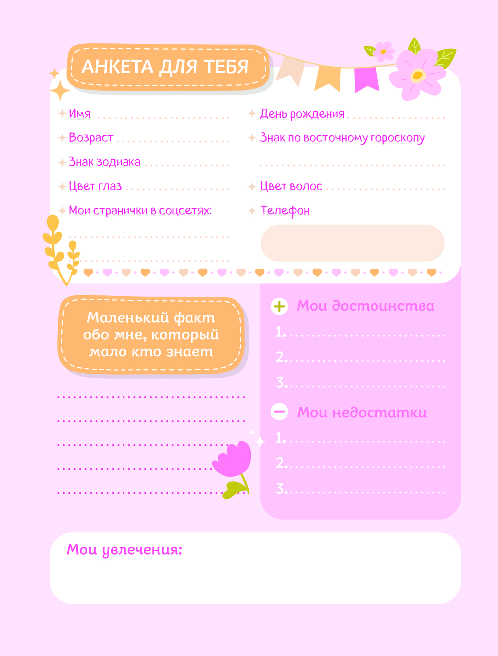 Незаменимый атрибут для каждой девочки! Анкета сделана из качественной бумаги, имеет удобный формат А5 и яркие наклейки-стикеры внутри. Под стильной обложкой девочку ждет яркий блок с множеством красочных страниц с анкетами для владелицы, ее подруг и друзей.