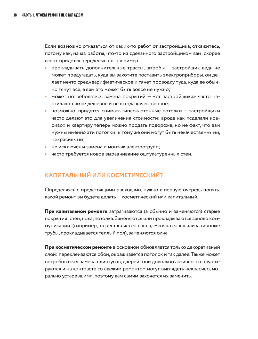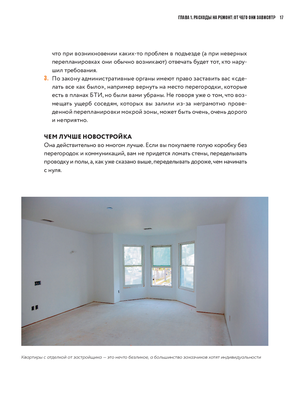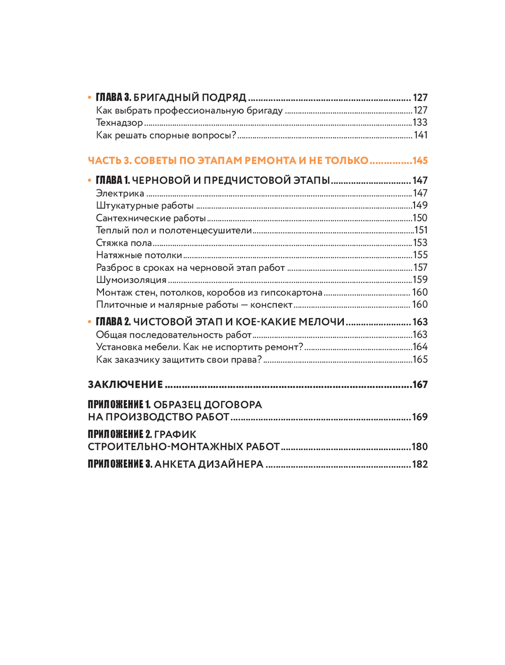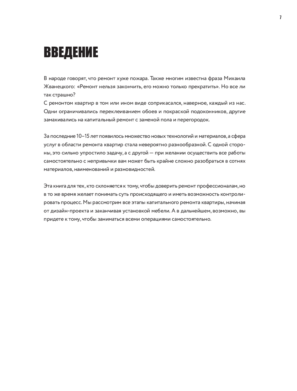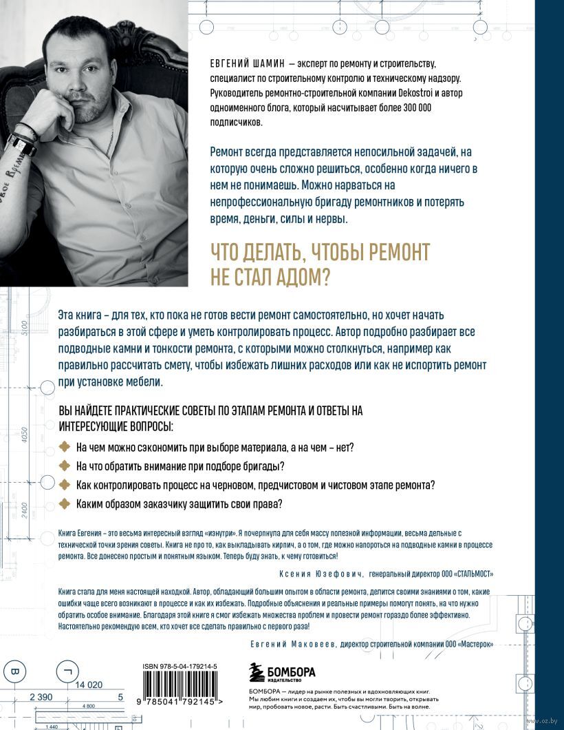 Качественный ремонт квартиры зачастую зависит не только от успешного выбора бригады ремонтников, но и от понимания заказчиком всех нюансов на разных этапах работ. Эта книга от эксперта и руководителя ремонтно-строительной компании подскажет что делать, чтобы ремонт не стал адом. Автор подробно рассказывает обо всех тонкостях капительного ремонта: от выбора материалов, подбора бригады и составления сметы до безопасной расстановки мебели. Благодаря этой книге вы сможете проконтролировать процесс ремонта на черновом, предчистовом и чистовом этапах, избежать лишних расходов и не подвергнуться риску со стороны недобросовестных исполнителей.
