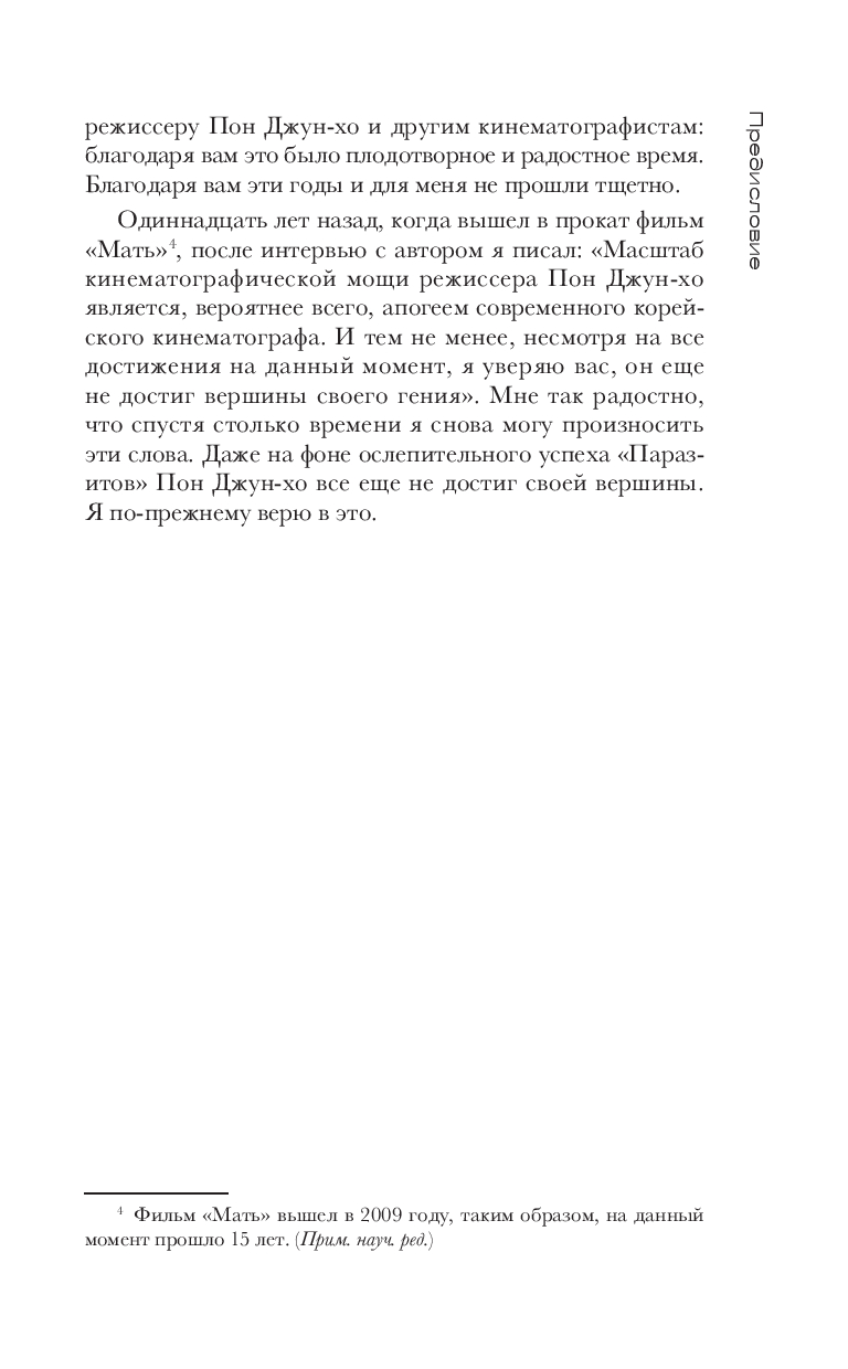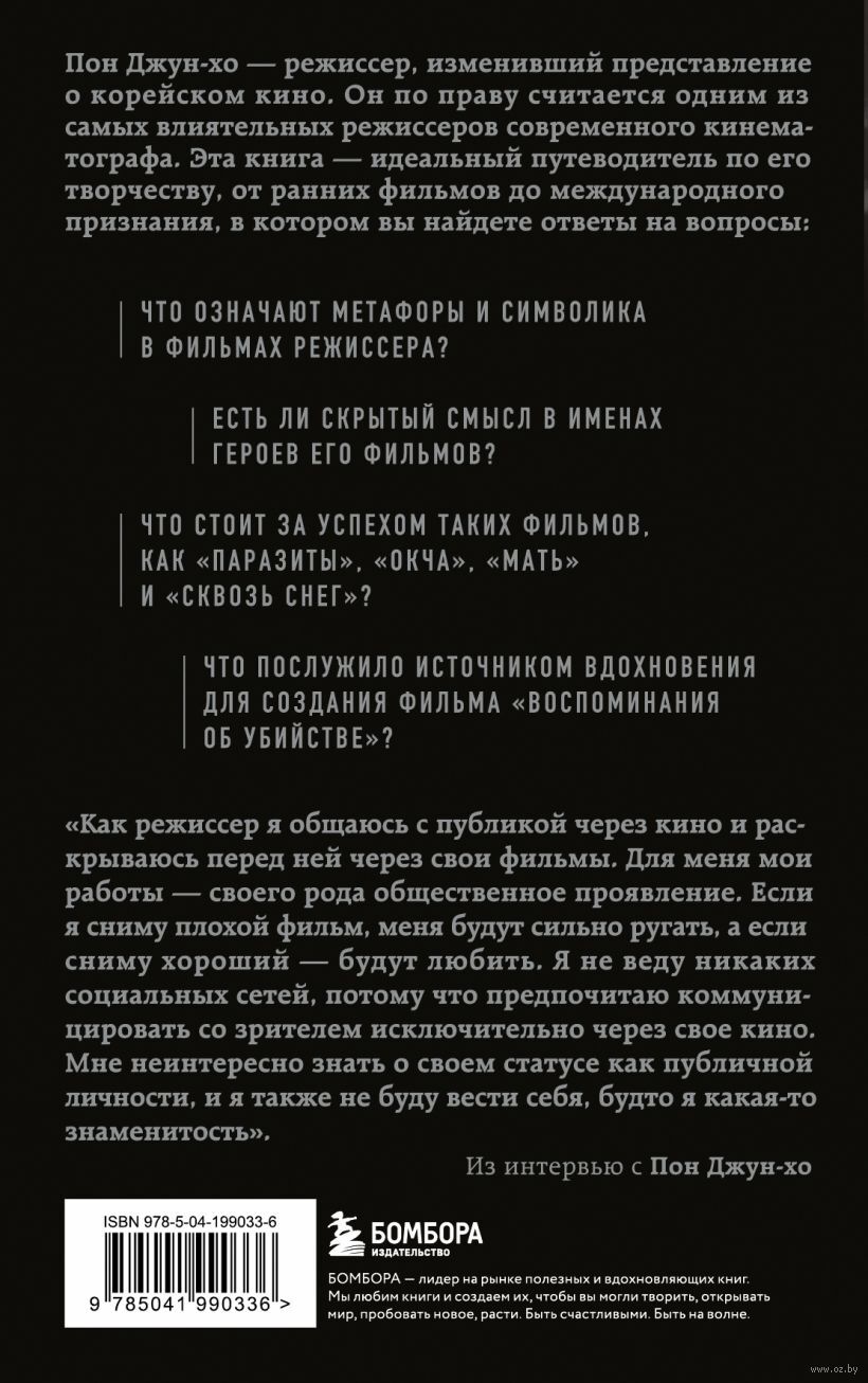 Книга корейского кинокритика Ли Дон-чжина о жизни и творчестве выдающегося южнокорейского режиссера Пон Джун-хо, известного своими уникальными фильмами, которые блестяще сочетают элементы жанрового кино с глубокими социальными и философскими темами. В книге автор подробно анализирует ключевые работы режиссера, такие как "Паразиты", "Окча", "Сквозь снег" и "Мать", рассматривая их стиль и влияние на мировой кинематограф, а также беседует с самим режиссером, который дал эксклюзивное интервью Ли Дон-чжину.