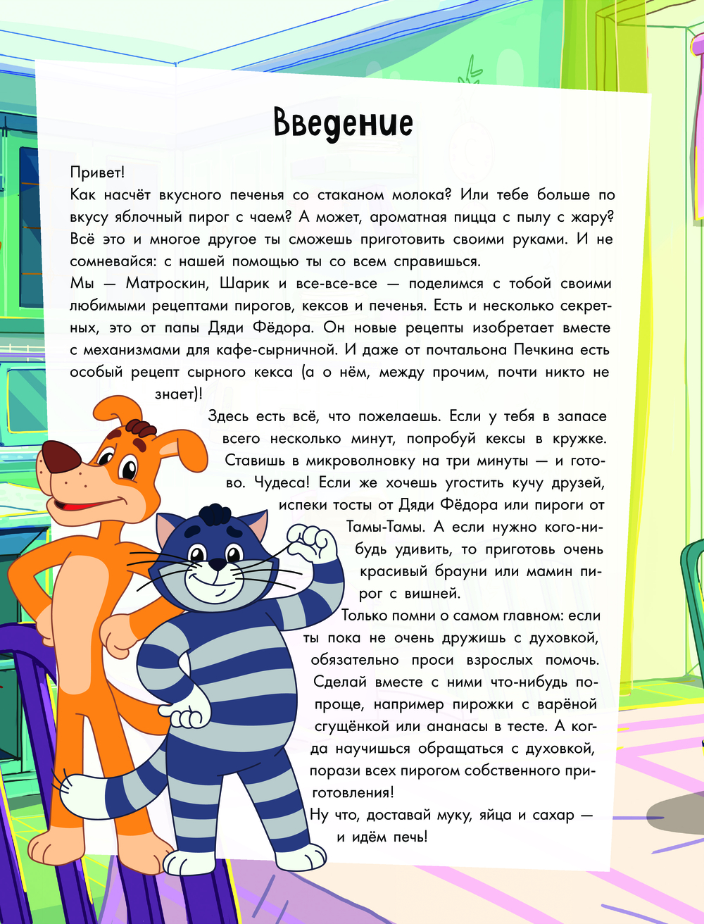 Да-да, все эти вкусности ребята запросто научатся готовить самостоятельно, ведь помогать им будут любимые герои мультсериала "Простоквашино"! Матроскин, Шарик, Дядя Фёдор и все-все-все расскажут про 22 рецепта своей любимой выпечки. Проверенные рецепты и пошаговые картинки помогут ребятам не ошибиться. А помощь взрослых потребуется только тогда, когда пирог нужно будет отправить в духовку.