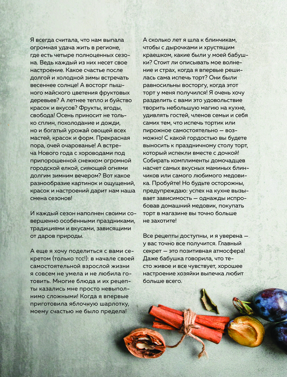 Рецепты великолепной домашней выпечки собрала для вас Анна Клыканова. Весенние жаворонки, тонкие блины с ажурной юбочкой, самый ароматный вишневый пирог, пирожки со щавелем на один укус, луковый тарт, зимний апельсиновый пирог – в каждом рецепте очарование сезона. Книга создана, чтобы вы через простые рецепты поймали вдохновение и сделали в бушующих буднях паузу для наслаждения моментом, для того, чтобы увидеть красоту весны, пышность лета, очарование осени и уютные объятия зимы.