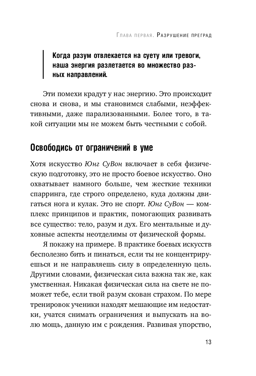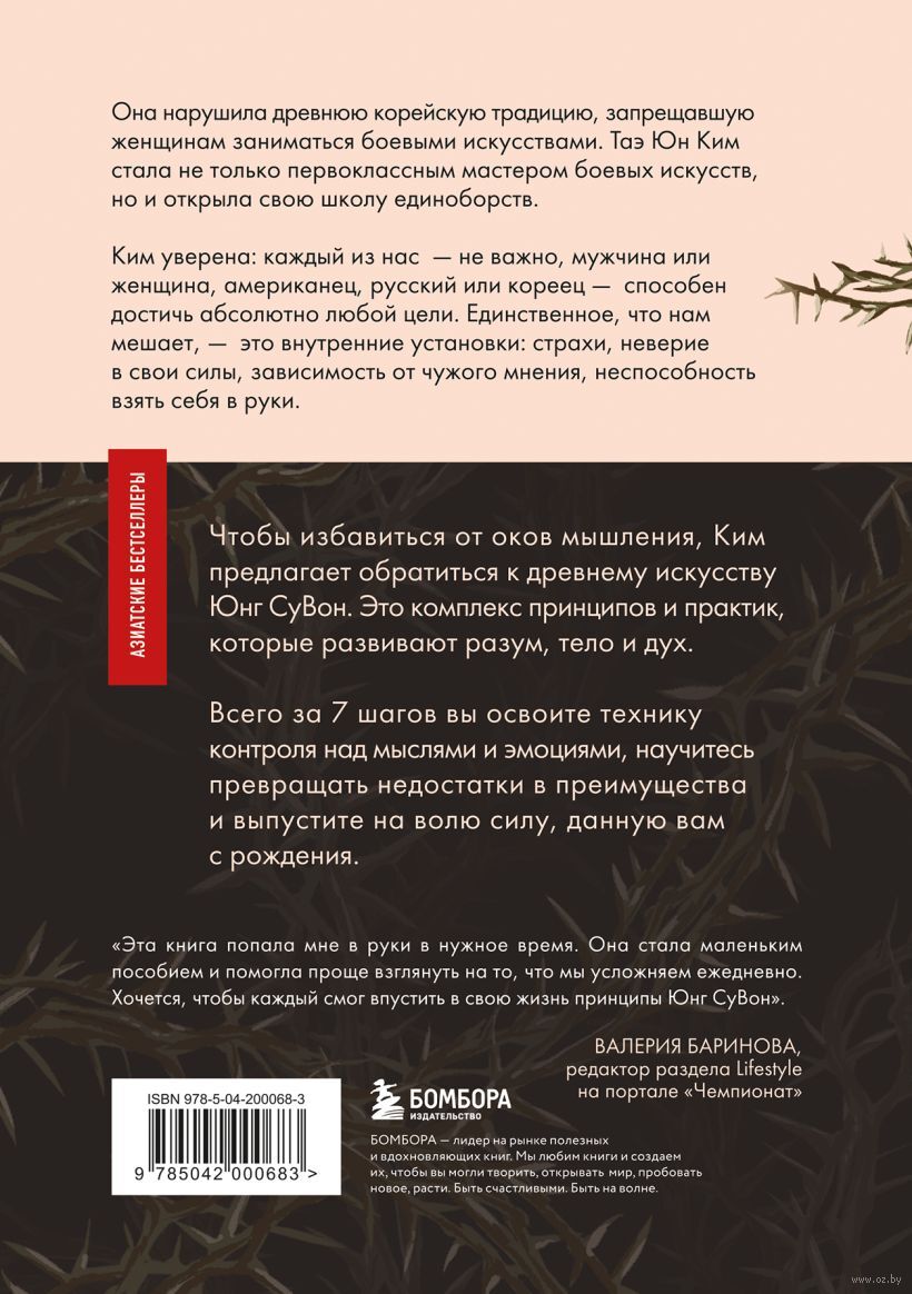 Чтобы избавиться от оков мышления, Ким предлагает обратиться к древнему искусству Юнг СуВон. Это комплекс принципов и практик, которые развивают разум, тело и дух. Всего за 7 шагов вы освоите технику контроля над мыслями и эмоциями, научитесь превращать недостатки в преимущества и выпустите на волю силу, данную вам с рождения.
