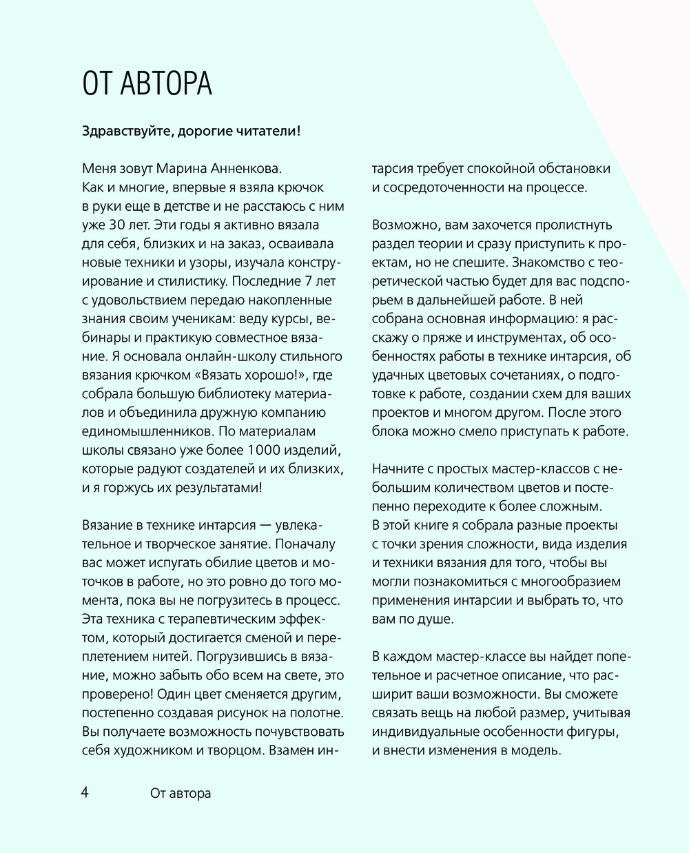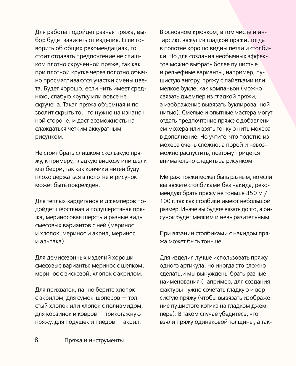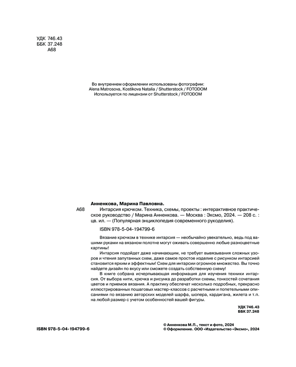 В книге собрана исчерпывающая информация для изучения техники интарсия. От выбора нити, крючка и рисунка до разработки схемы, тонкостей сочетания цветов и приемов вязания. А практику обеспечат несколько подробных, прекрасно иллюстрированных пошаговых мастер-классов с расчетными и попетельными описаниями по вязанию авторских моделей шарфа, шоппера, кардигана, жилета и т.п. на любой размер с учетом особенностей вашей фигуры.