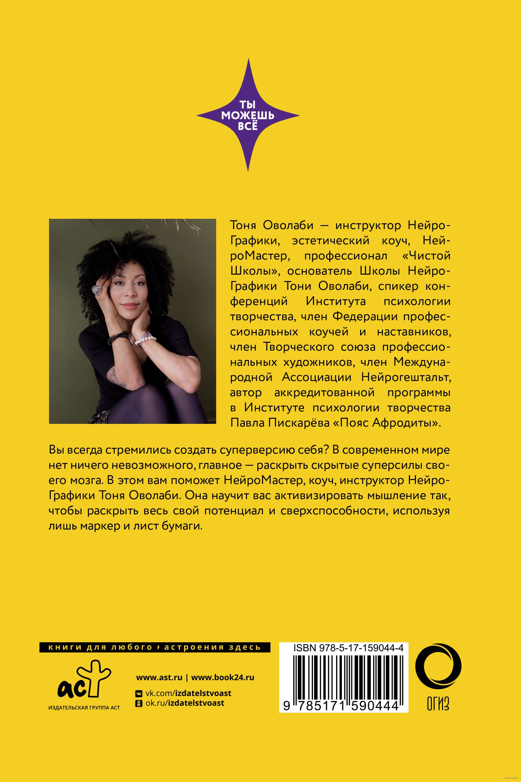 Вы всегда стремились создать суперверсию себя? В современном мире нет ничего невозможного, главное – настроиться на позитивный лад, и в этом вам поможет нейромастер, эстетический коуч Тоня Оволаби. Она научит вас видеть свои ресурсы, возможности, активизировать мышление так, чтобы раскрыть свои потенциал и сверхспособности, используя лишь карандаш и лист бумаги.