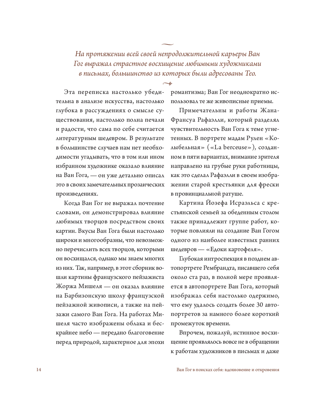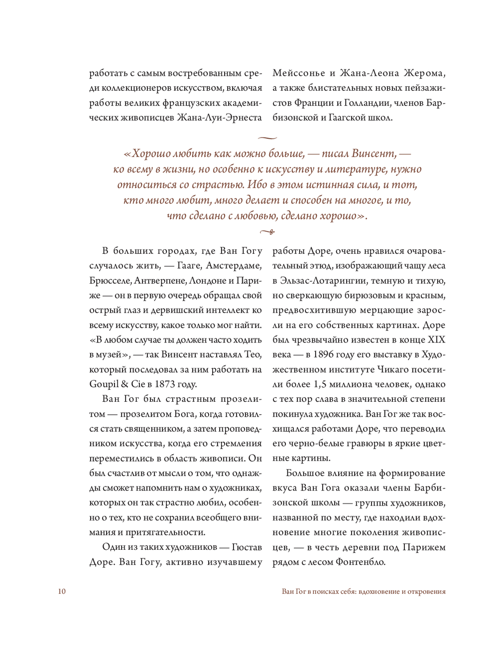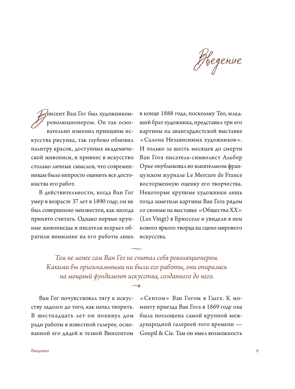 В его картинах и письмах можно найти цитаты и размышления о природе, религии, жизни крестьян, искусстве далеких стран, различных школ, направлений и самом себе. Вы получите настоящее удовольствие от знакомства с Ван Гогом и с художниками, которые стали частью его творческого пути.