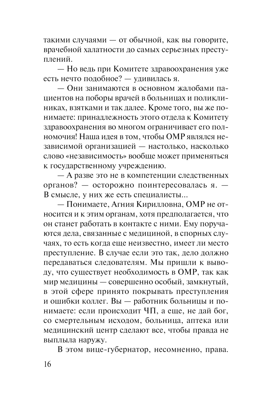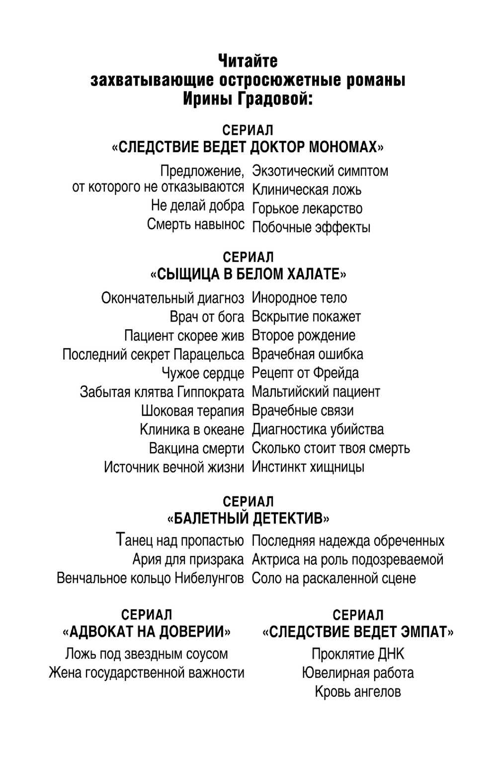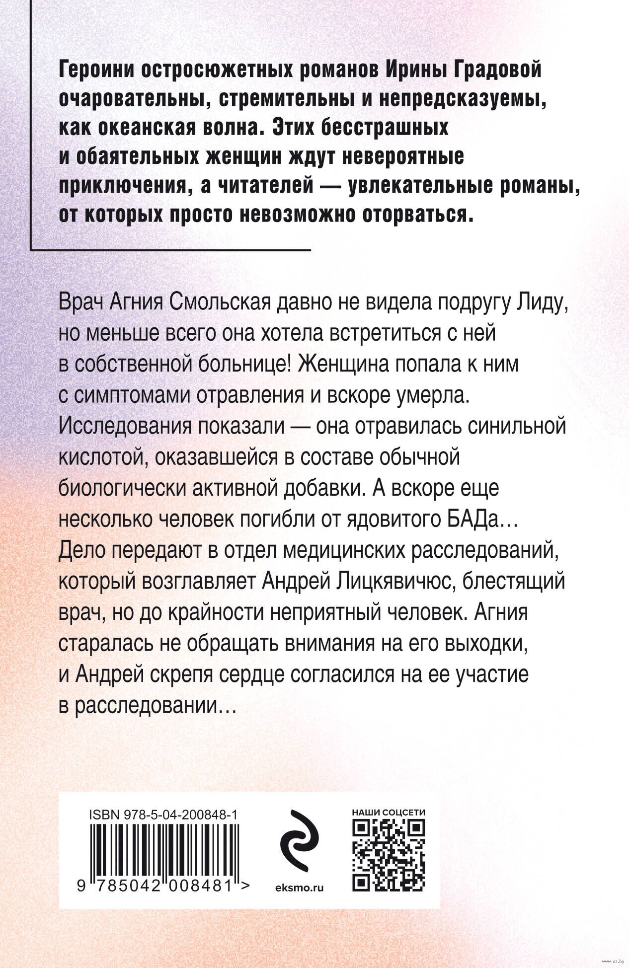 Врач Агния Смольская давно не видела подругу Лиду, но меньше всего она хотела встретиться с ней в собственной больнице! Женщина попала к ним с симптомами отправления, и вскоре умерла. Исследования показали – она отравилась синильной кислотой, оказавшейся в составе обычной биологически активной добавки. А вскоре еще несколько человек погибли от ядовитого БАДа... Дело передают в отдел медицинских расследований, который возглавляет Андрей Лицкявичюс, блестящий врач, но до крайности неприятный человек. Агния старалась не обращать внимания на его выходки, и Андрей скрепя сердце согласился на ее участие в расследовании...