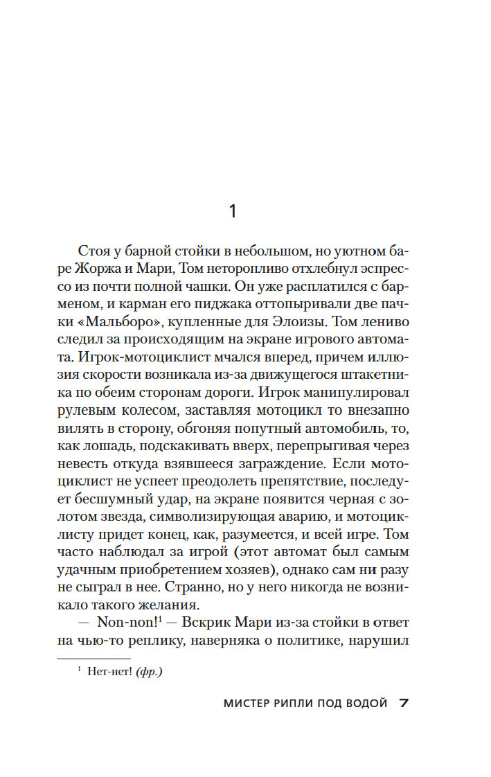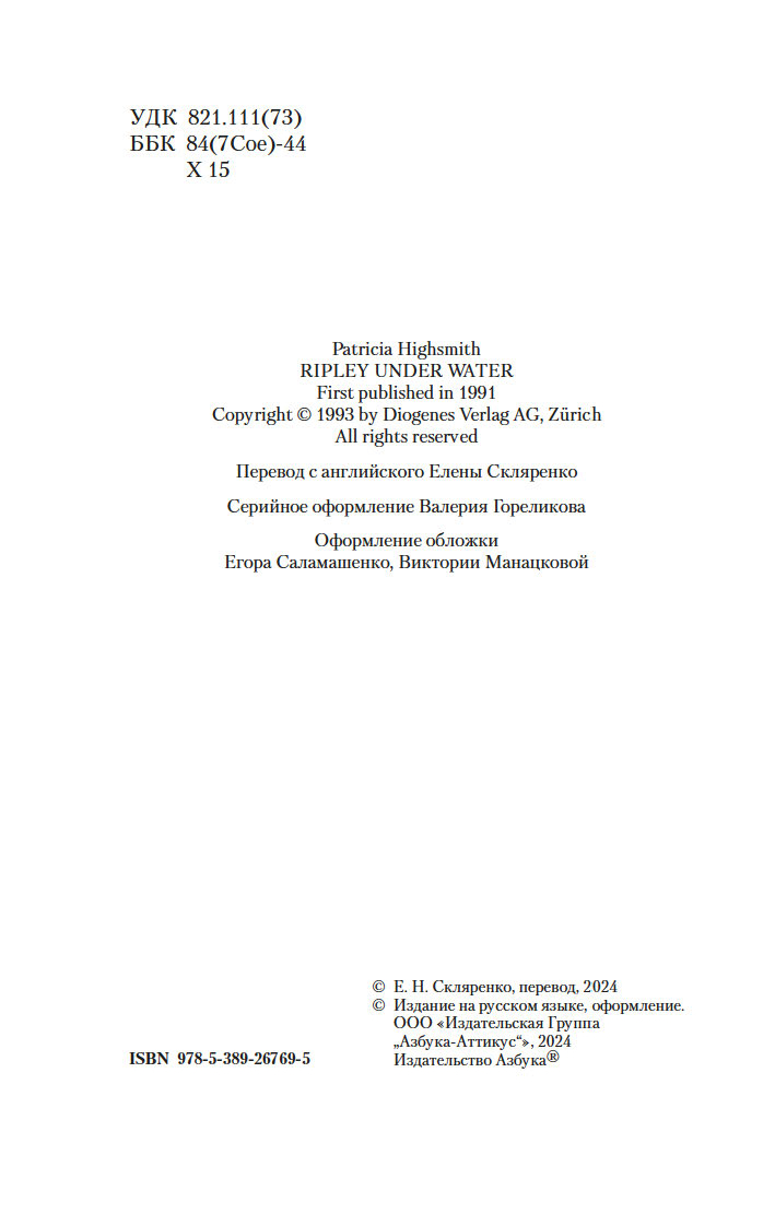 "Мистер Рипли под водой" – пятый, и последний роман в серии о самом известном персонаже Патриции Хайсмит, американской писательницы, признанном мастере психологического детектива. Ценитель музыки и цветов, заботливый муж, эстет и гедонист, а в прошлом ловкий авантюрист и хладнокровный убийца, Том Рипли давно уже предпочитает рискованным аферам с подделкой картин занятия в саду, а кулинарные шедевры значат для него не меньше, чем шедевры живописи. Но прошлое не так легко отпустить, и из его темных глубин выплывают порой жуткие призраки, давно похороненные под толщей воды...
