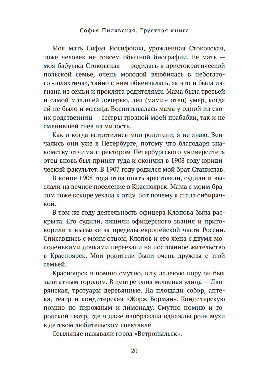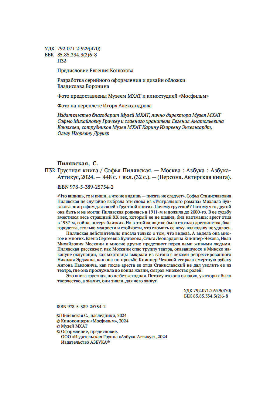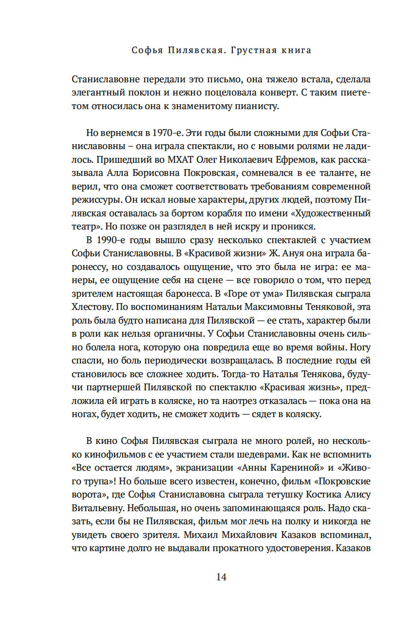 "Что видишь, то и пиши, а что не видишь – писать не следует". Софья Станиславовна Пилявская не случайно выбрала эти слова из "Театрального романа" Михаила Булгакова эпиграфом для своей "Грустной книги". Почему грустной? Потому что другой она быть и не могла: Пилявская родилась в 1911-м и дожила до 2000-го. В ее судьбу вместился весь страшный ХХ век, который ее не щадил, бил наотмашь: арест отца в 1937-м, война, потеря близких. Но в этой женщине было столько достоинства, благородства, столько мудрости и стойкости, что сломить ее веку-волкодаву не удалось.