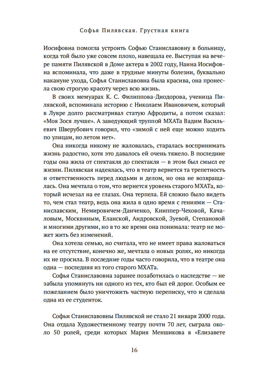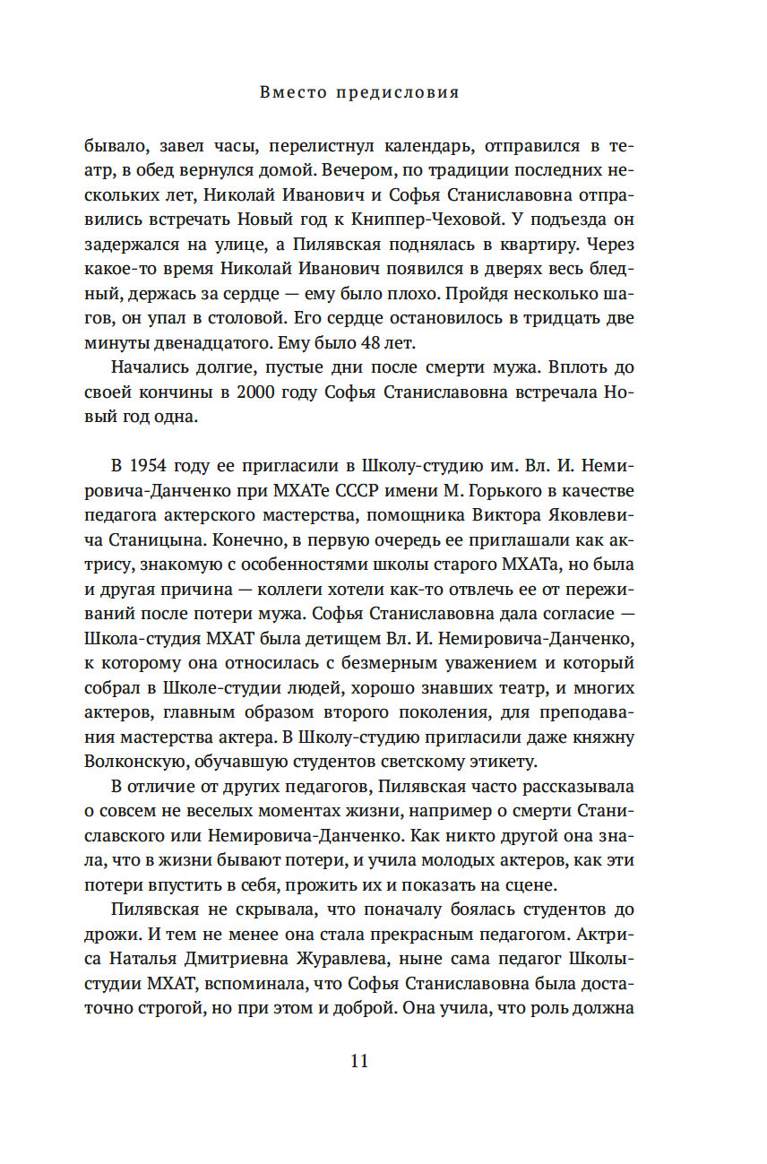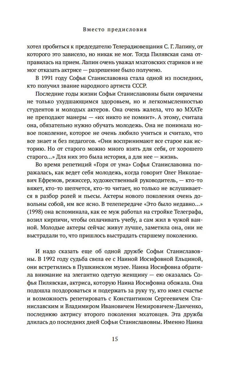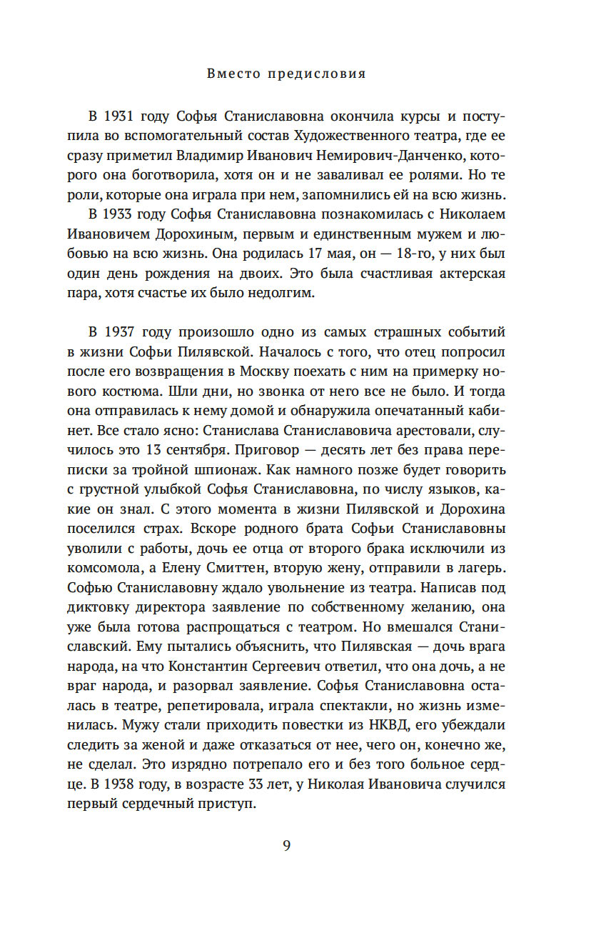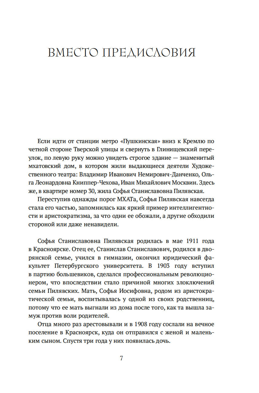 Пилявская действительно писала только о том, что видела. А видела она многое и многих. Елена Сергеевна Булгакова, Ольга Леонардовна Книппер-Чехова, Иван Михайлович Москвин и многие другие предстанут перед вами живыми людьми. Пилявская расскажет, как Иван Москвин спас труппу театра, оказавшуюся в Минске накануне оккупации, как мхатовцы выкрали из вагона с зеками репрессированного Николая Эрдмана, как она по просьбе Книппер-Чеховой стирала смертную рубаху Антона Павловича, как после ареста ее отца Станиславский не дал уволить ее из театра, где она прослужила до конца жизни, сыграв множество ролей.