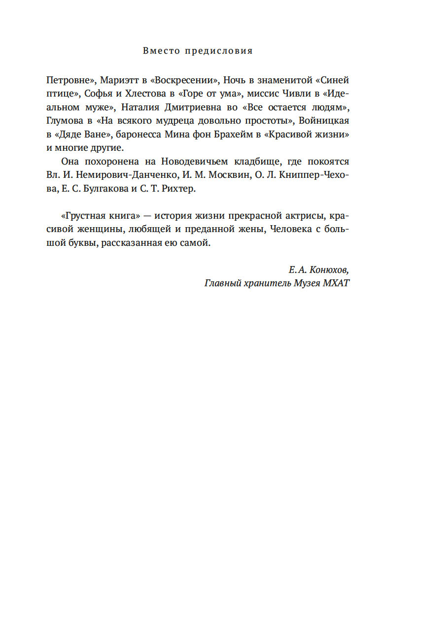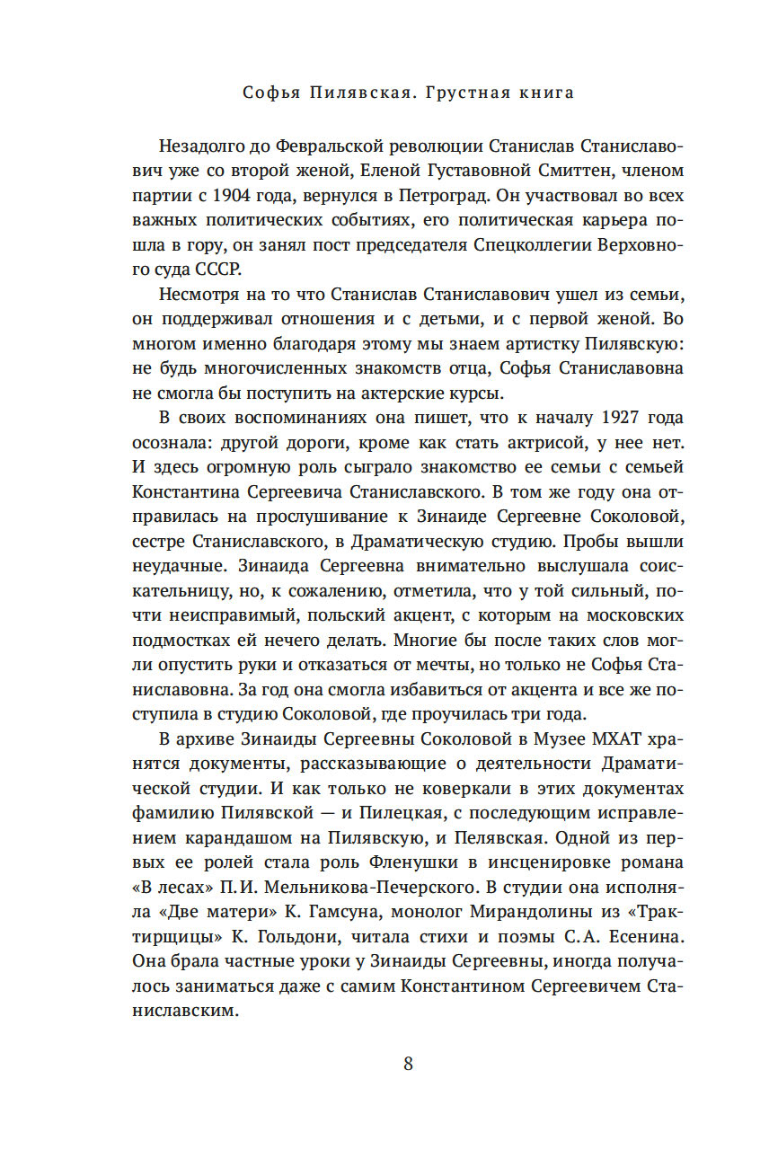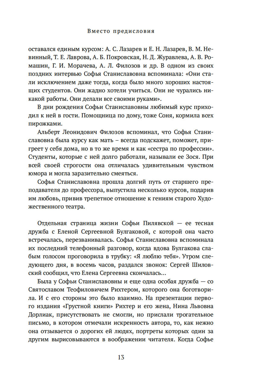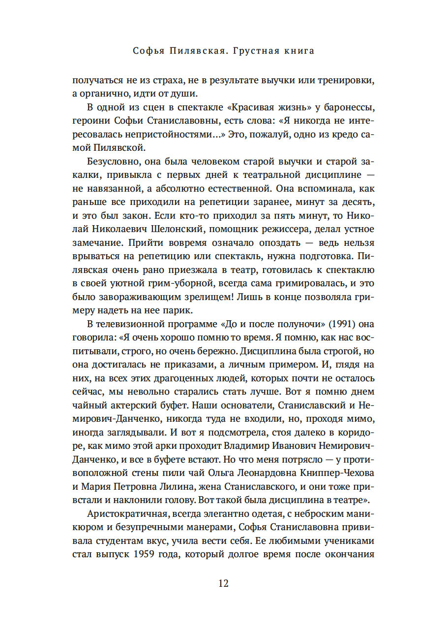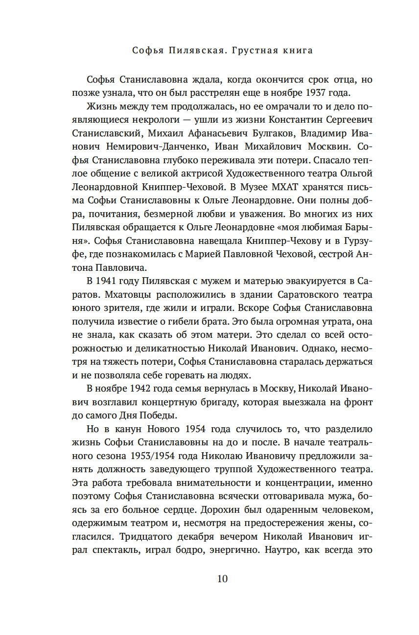 Пилявская действительно писала только о том, что видела. А видела она многое и многих. Елена Сергеевна Булгакова, Ольга Леонардовна Книппер-Чехова, Иван Михайлович Москвин и многие другие предстанут перед вами живыми людьми. Пилявская расскажет, как Иван Москвин спас труппу театра, оказавшуюся в Минске накануне оккупации, как мхатовцы выкрали из вагона с зеками репрессированного Николая Эрдмана, как она по просьбе Книппер-Чеховой стирала смертную рубаху Антона Павловича, как после ареста ее отца Станиславский не дал уволить ее из театра, где она прослужила до конца жизни, сыграв множество ролей.