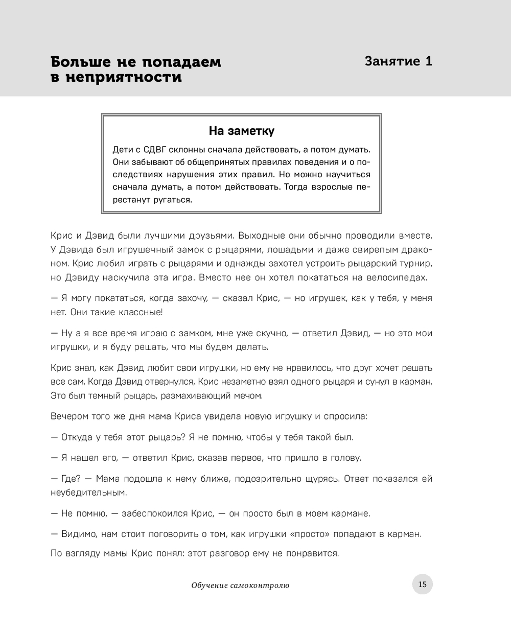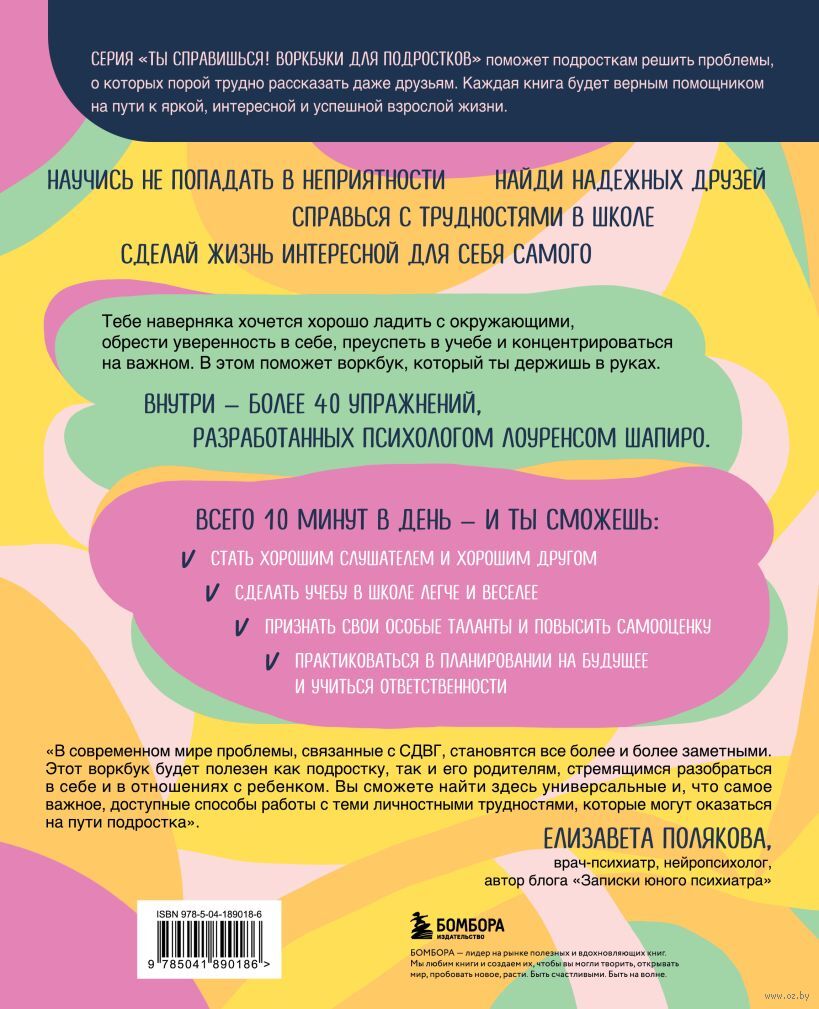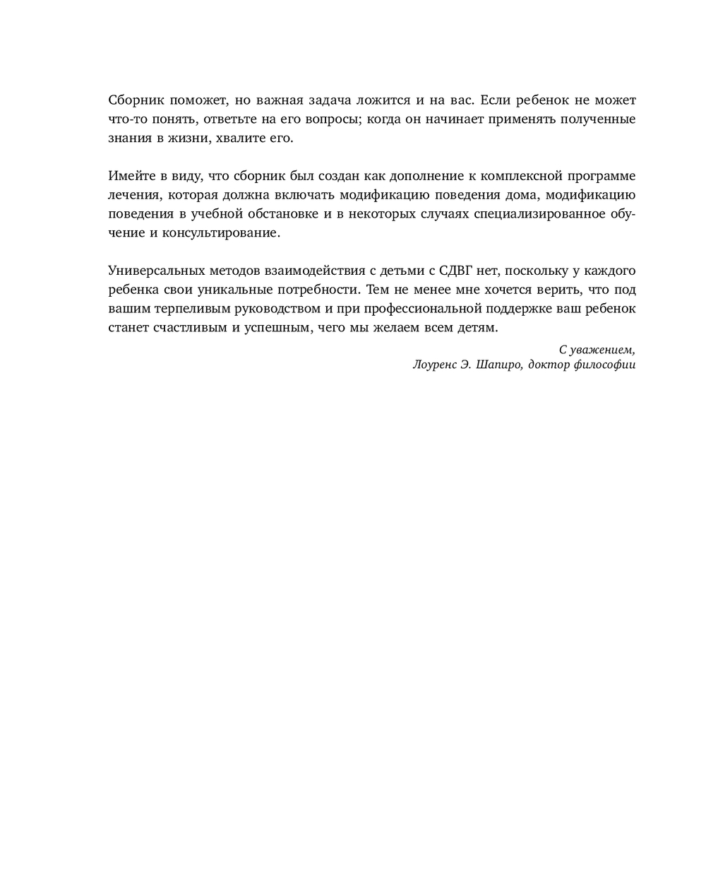 В своей книге психолог Лоуренс Шапиро представляет более сорока 10-минутных игр и занятий, которые подростки с диагнозом СДВГ и без него могут выполнять, чтобы научиться заводить друзей, обрести уверенность в себе, научиться контролировать свою активность и внимание.