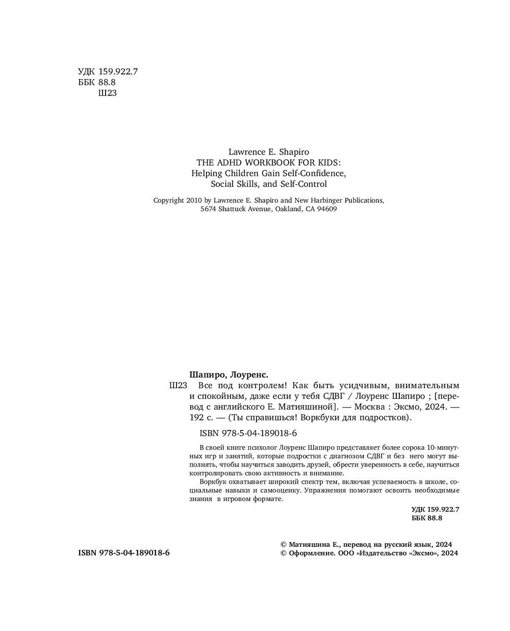 | Название в оригинале | The ADHD Workbook for Kids: Helping Children Gain Self-Confidence, Social Skills, and Self-Control (Instant Help Book for Parents & Kids) |