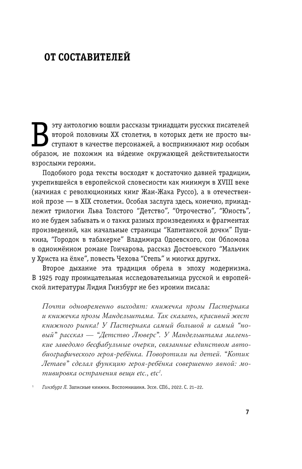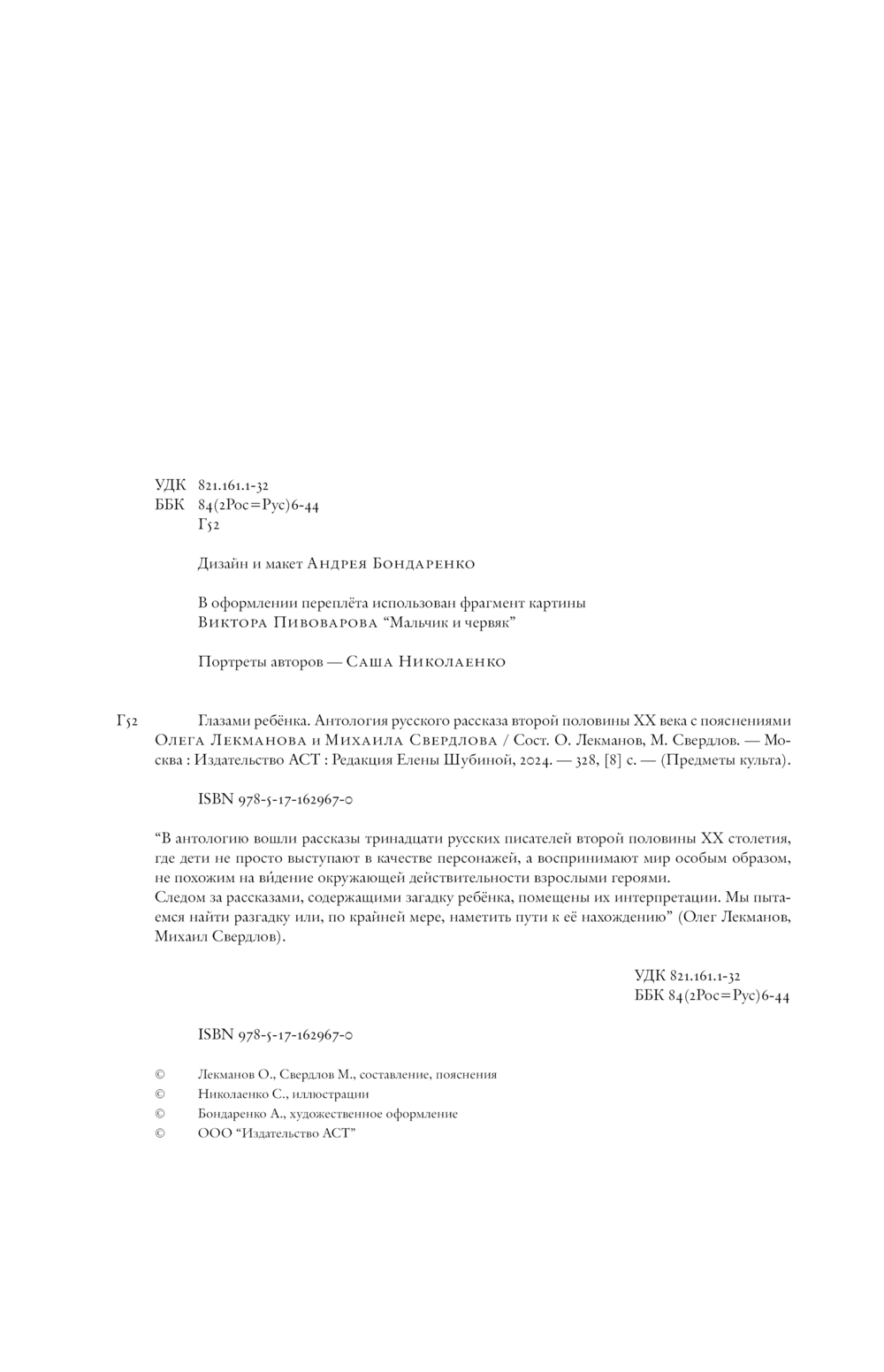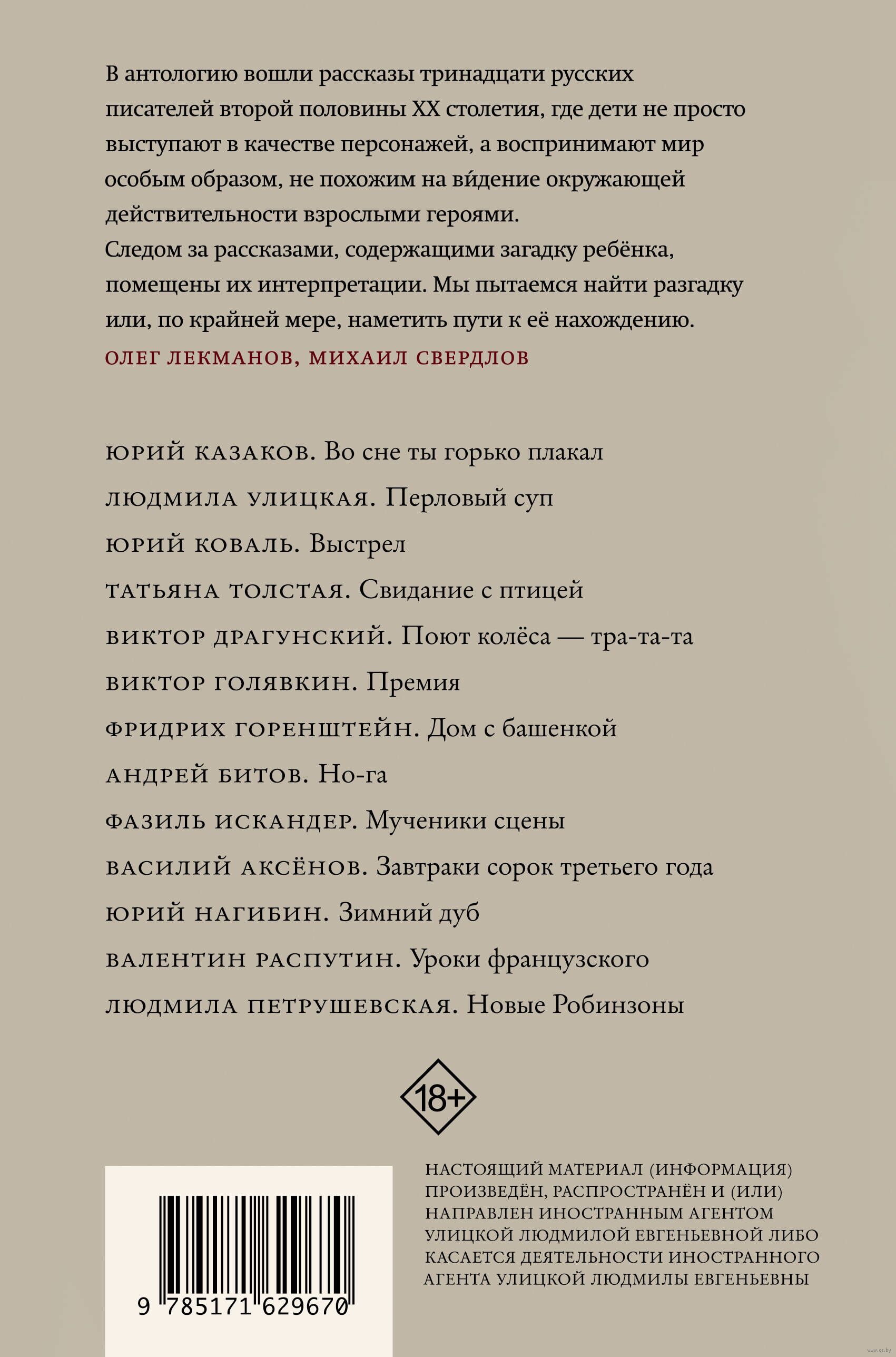 "В антологию вошли рассказы тринадцати русских писателей второй половины ХХ столетия, где дети не просто выступают в качестве персонажей, а воспринимают мир особым образом, не похожим на ви́дение окружающей действительности взрослыми героями. Следом за рассказами, содержащими загадку ребёнка, помещены их интерпретации. Мы пытаемся найти разгадку или, по крайней мере, наметить пути к её нахождению". (Олег Лекманов, Михаил Свердлов).