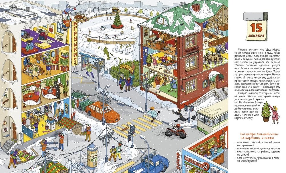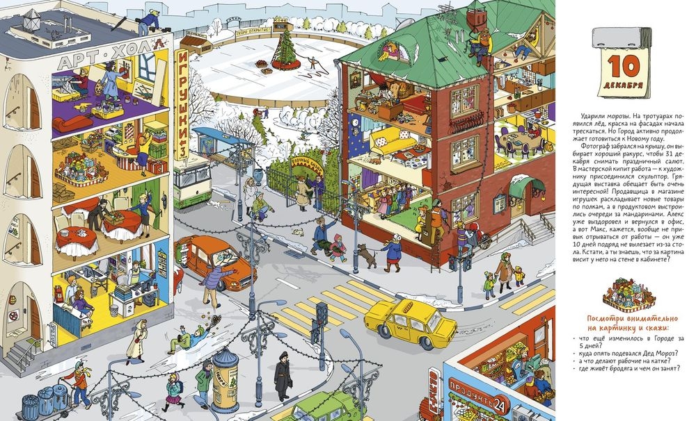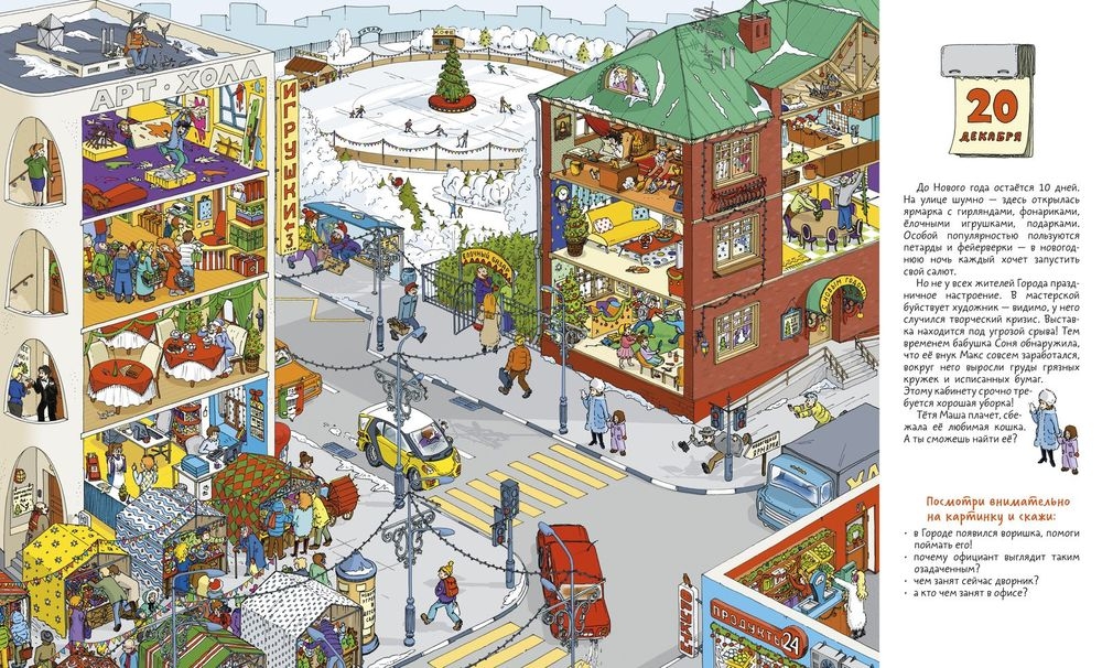 Где можно встретить Деда Мороза? Да вот же он! Ест мороженое в кафе! А где кошка тети Маши, которая сбежала перед Новым годом? Вот она, лежит в пустой миске из-под салата, пока все спят 1 января. Улицы и магазины украшены, влюбленные решают пожениться прямо у входа на елочный базар. А как замораживают лед на катке?