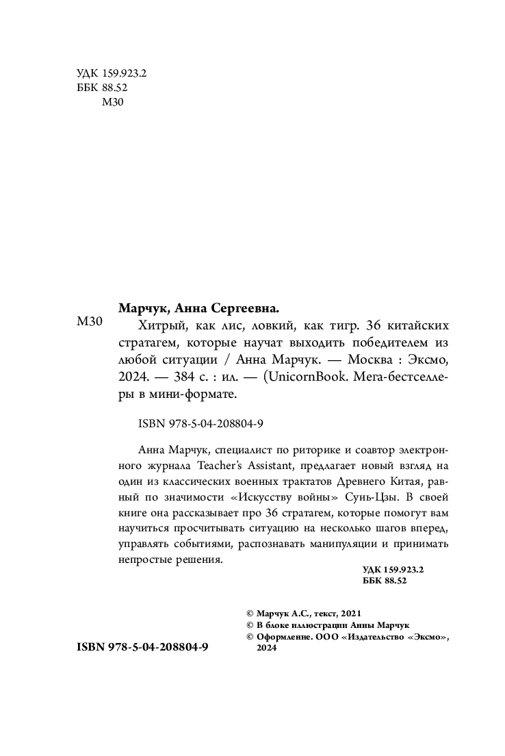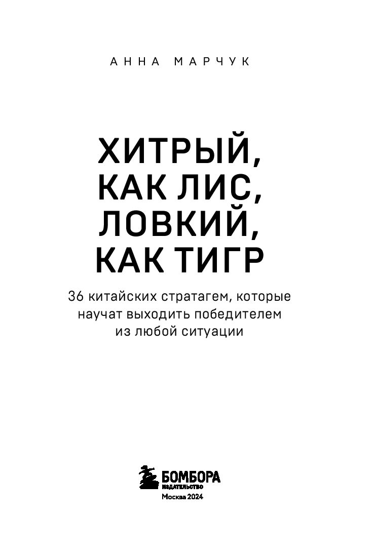 Анна Марчук предлагает по-новому взглянуть на один из классических военных трактатов Древнего Китая, равный по значимости "Искусству войны" Сунь Цзы. 36 стратагем – это 36 приемов, уловок и хитростей, которые научат вас: