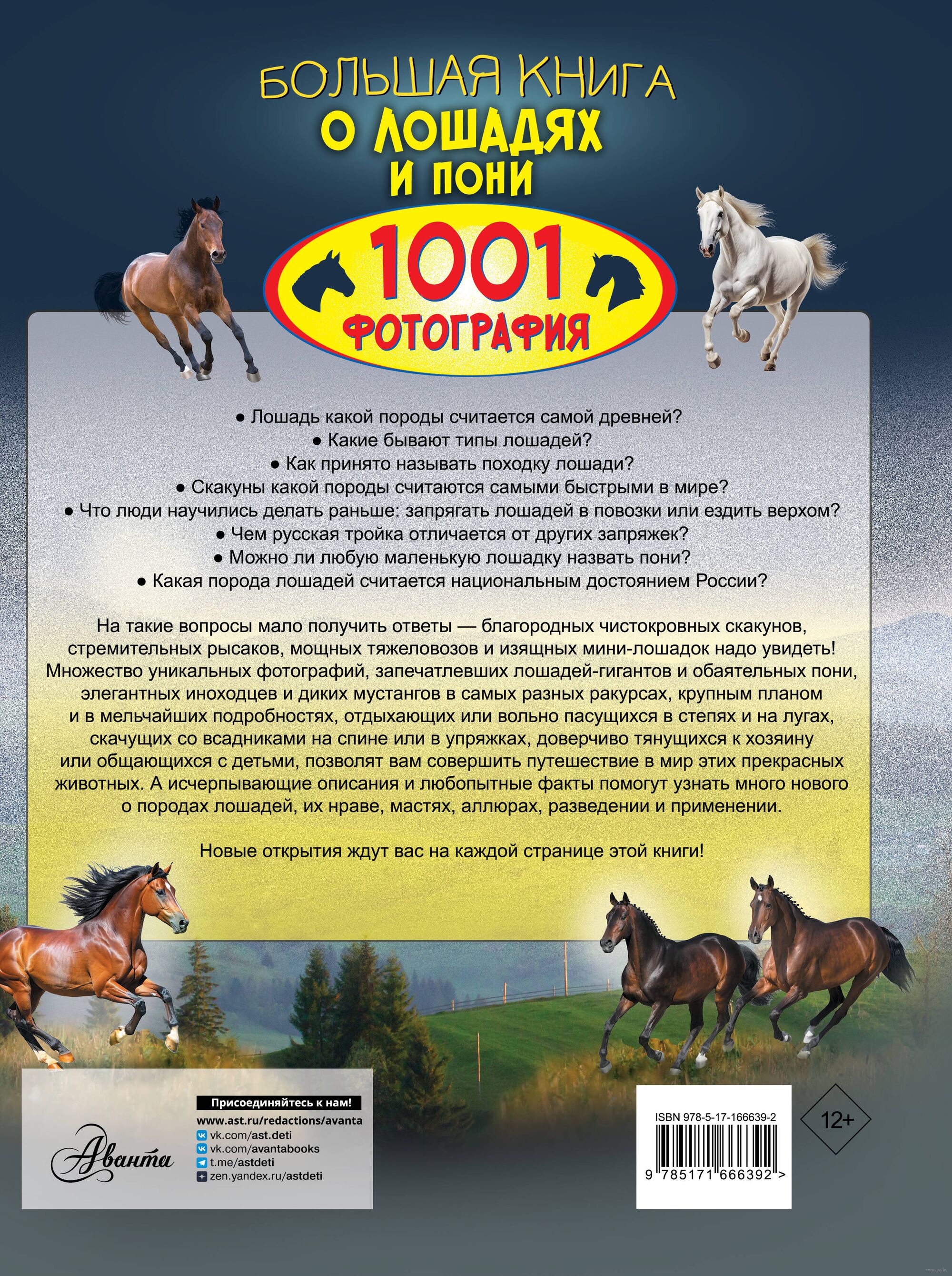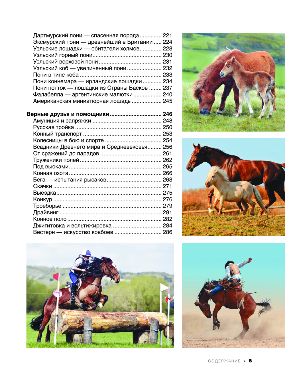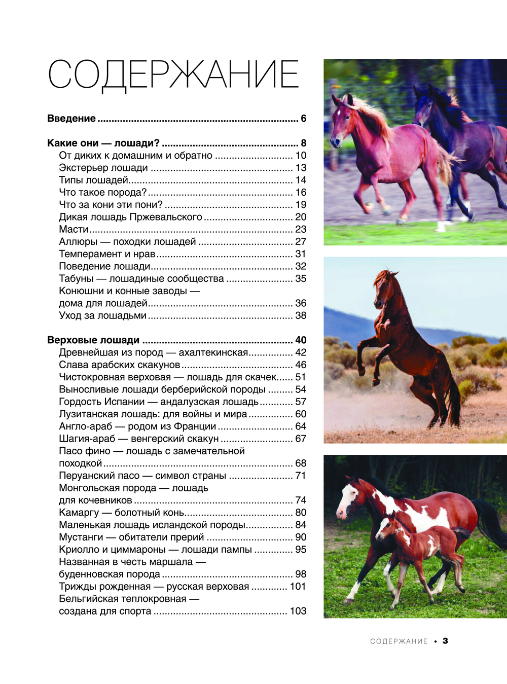 На уникальных фотографиях вы сможете рассмотреть в эффектных ракурсах и мельчайших подробностях лошадей самых разных размеров и пород. Рожденные в пустыне верные ахалтекинцы, гордые и быстрые андалузы, неукротимые вольные мустанги, элегантные орловские рысаки, сильные владимирские тяжеловозы, огромные выносливые шайры, маленькие крепкие пони, изящные и дружелюбные мини-лошадки и другие кони предстанут перед вашими глазами, восхищая природным обаянием, гармонией и стремительностью движений. А краткие, но исчерпывающие статьи, сопровождающие зрелищные съемки, позволят больше узнать об этих прекрасных животных, условиях их содержания и выведения, об аллюрах и мастях, темпераменте и нраве, а также значении в жизни человека.