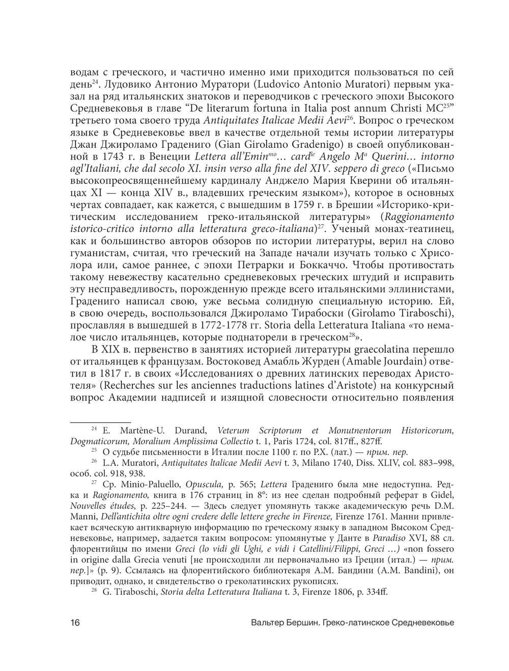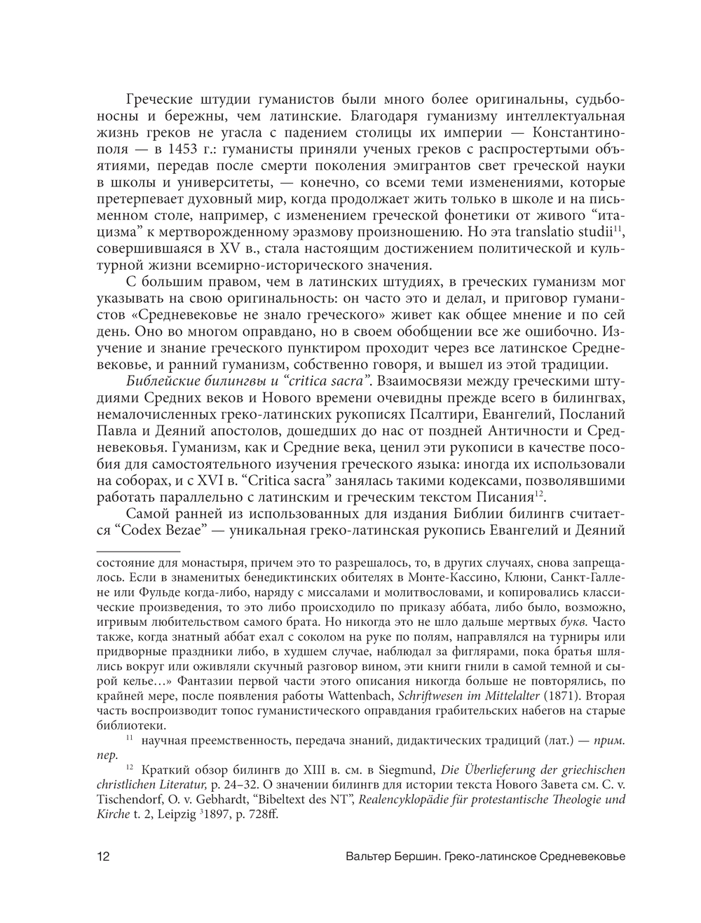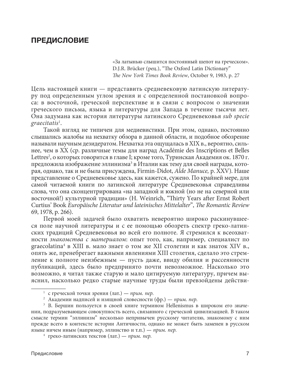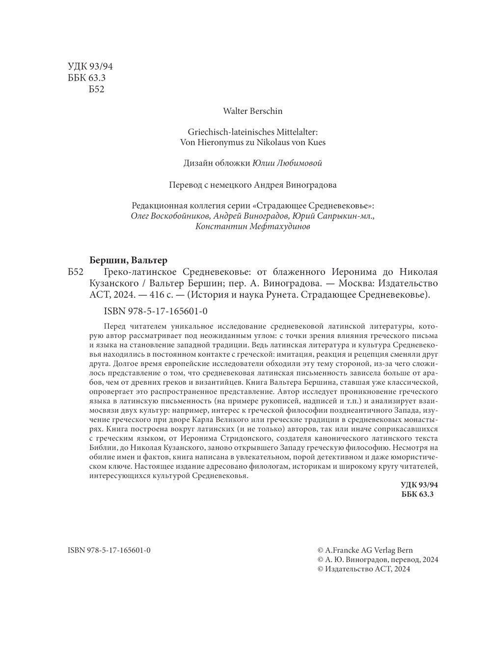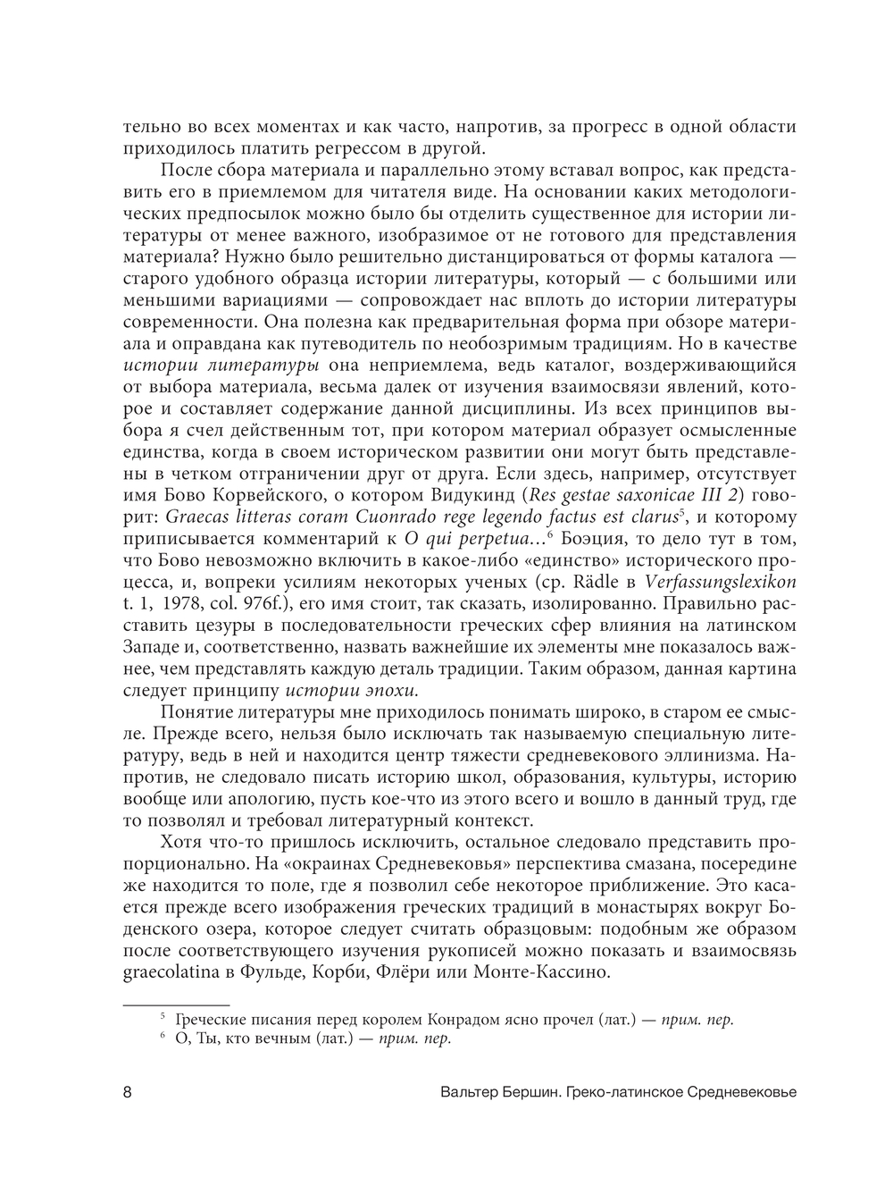 Перед читателем уникальное исследование средневековой латинской литературы, которую автор рассматривает под неожиданным углом: с точки зрения влияния греческого письма и языка на становление западной традиции. Ведь латинская литература и культура Средневековья находились в постоянном контакте с греческой: имитация, реакция и рецепция сменяли друг друга. Долгое время европейские исследователи обходили эту тему стороной, из-за чего сложилось представление о том, что средневековая латинская письменность зависела больше от арабов, чем от древних греков и византийцев. Книга Вальтера Бершина, ставшая уже классической, опровергает это распространенное представление. Автор исследует проникновение греческого языка в латинскую письменность (на примере рукописей, надписей и т.п.) и анализирует взаимосвязи двух культур: например, интерес к греческой философии позднеантичного Запада, изучение греческого при дворе Карла Великого или греческие традиции в средневековых монастырях.