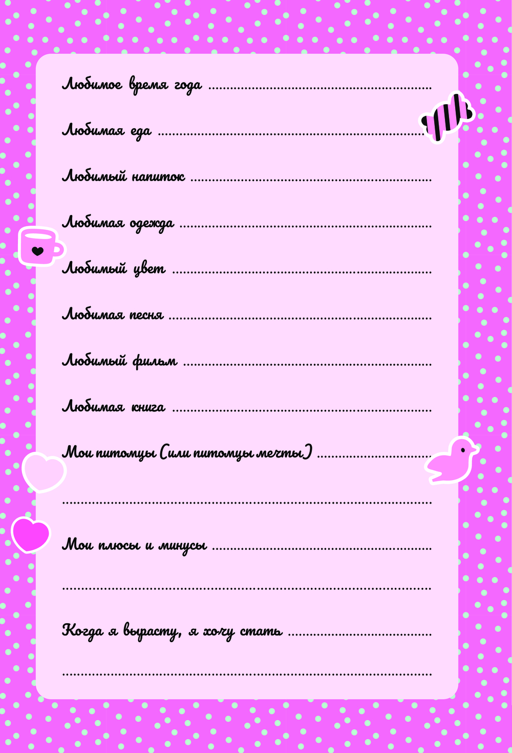 Анкеты и тесты помогут тебе лучше узнать себя и своих друзей, задания вдохновят на новые свершения, а яркие наклейки идеально подойдут для украшения твоих записей!