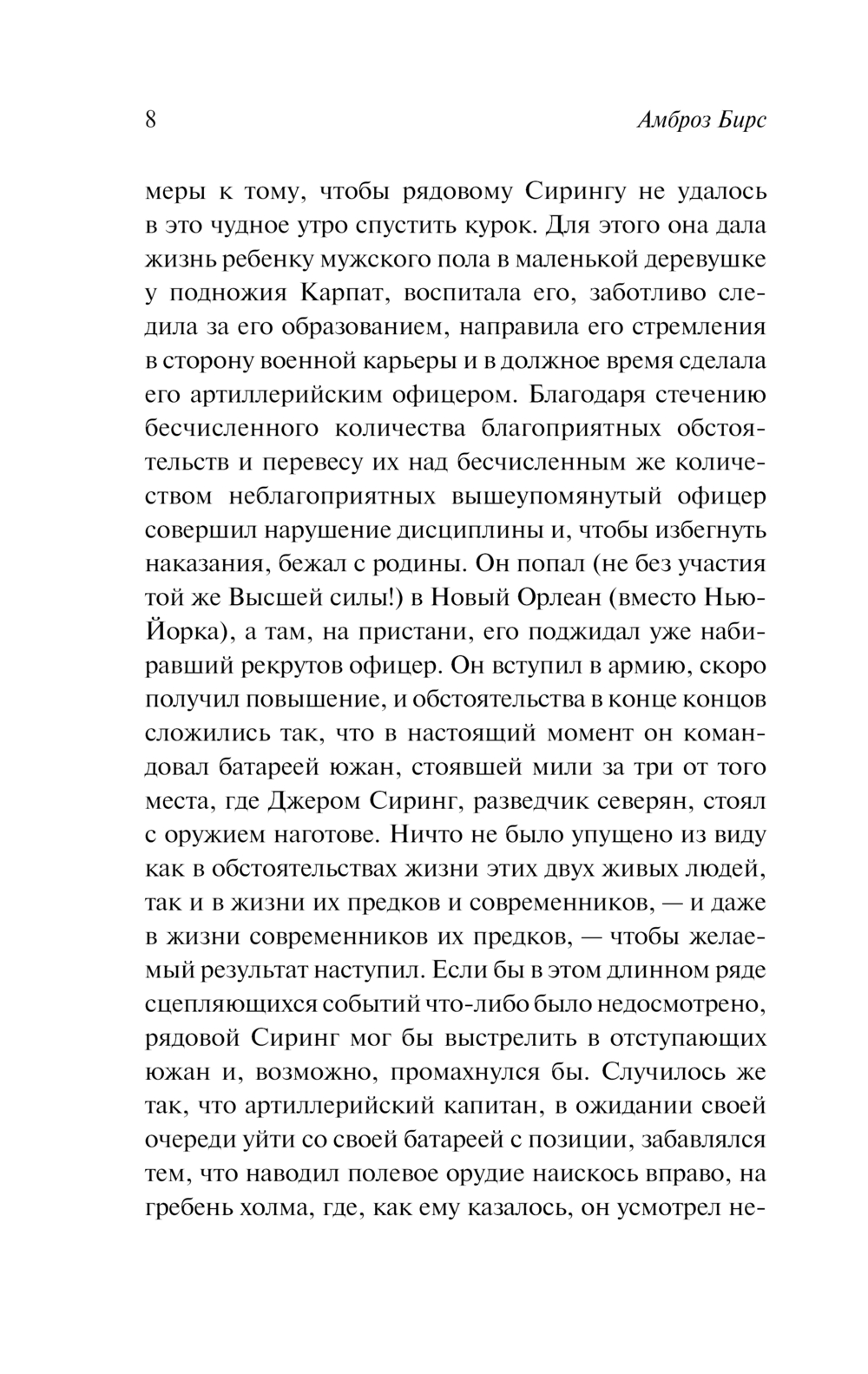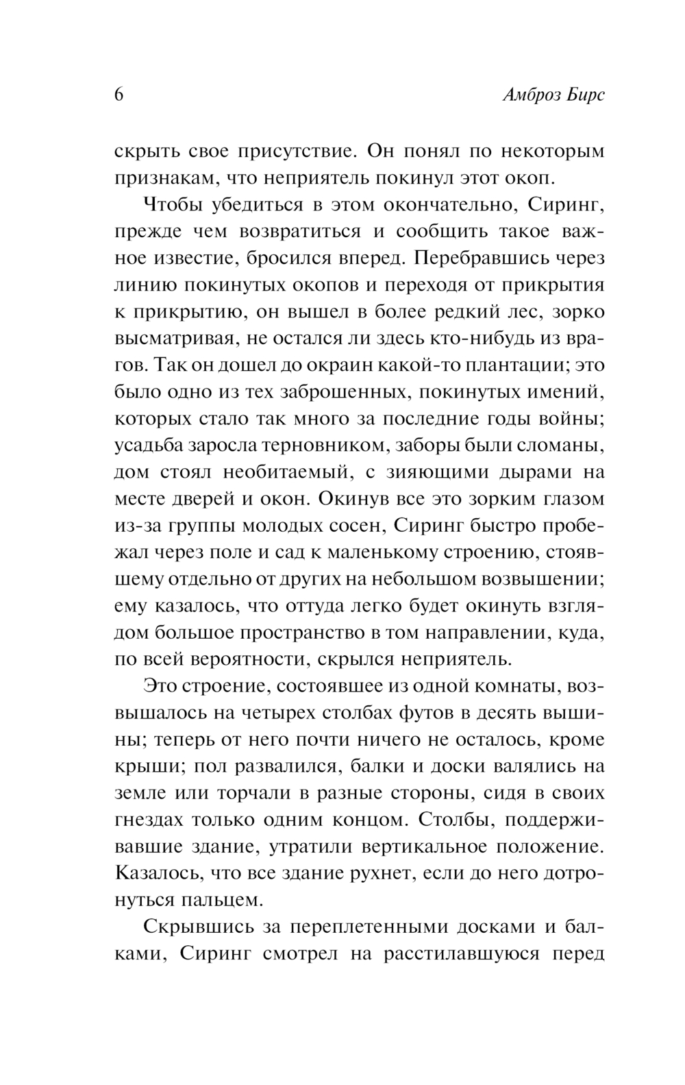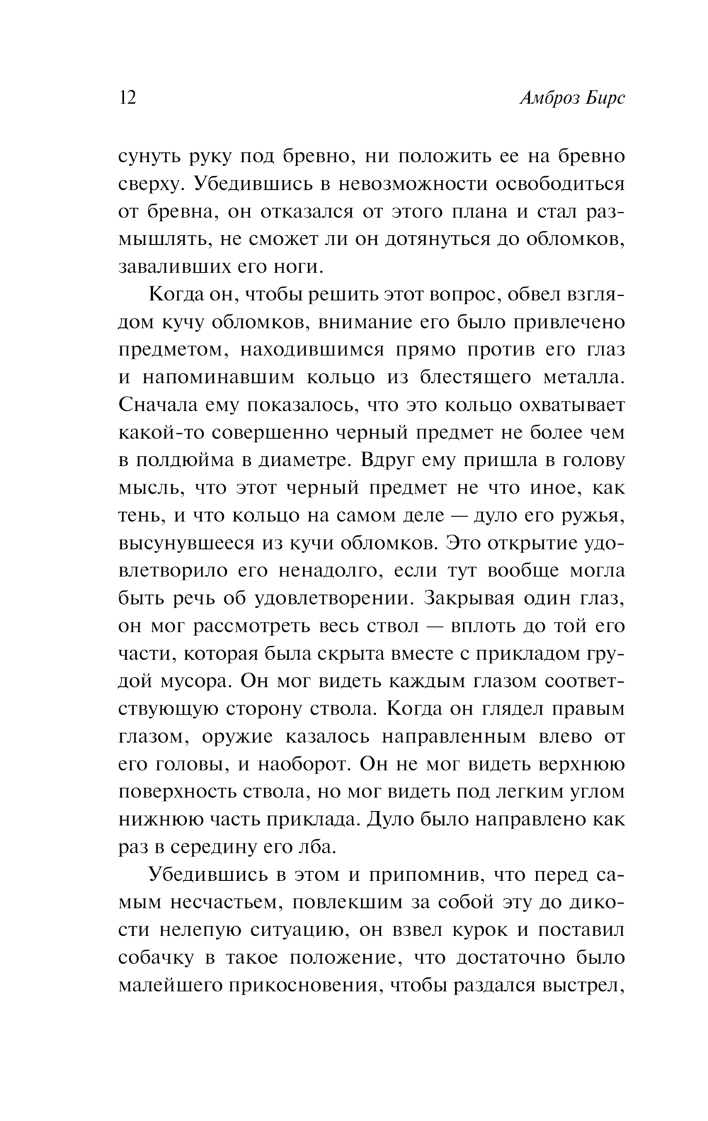 Амброз Бирс – мастер короткой прозы, за свою жизнь он написал более ста новелл, большинство из которых относятся к так называемым "страшным рассказам" из-за их гнетущей и таинственной атмосферы. Его всегда интересовали психология ужаса и метафизические загадки, поэтому творчество автора наполнено таинственными ситуациями с непредсказуемо-ошеломительными развязками, где герои погибают не от выстрела, ножа или лап зверя, а от самого страха.