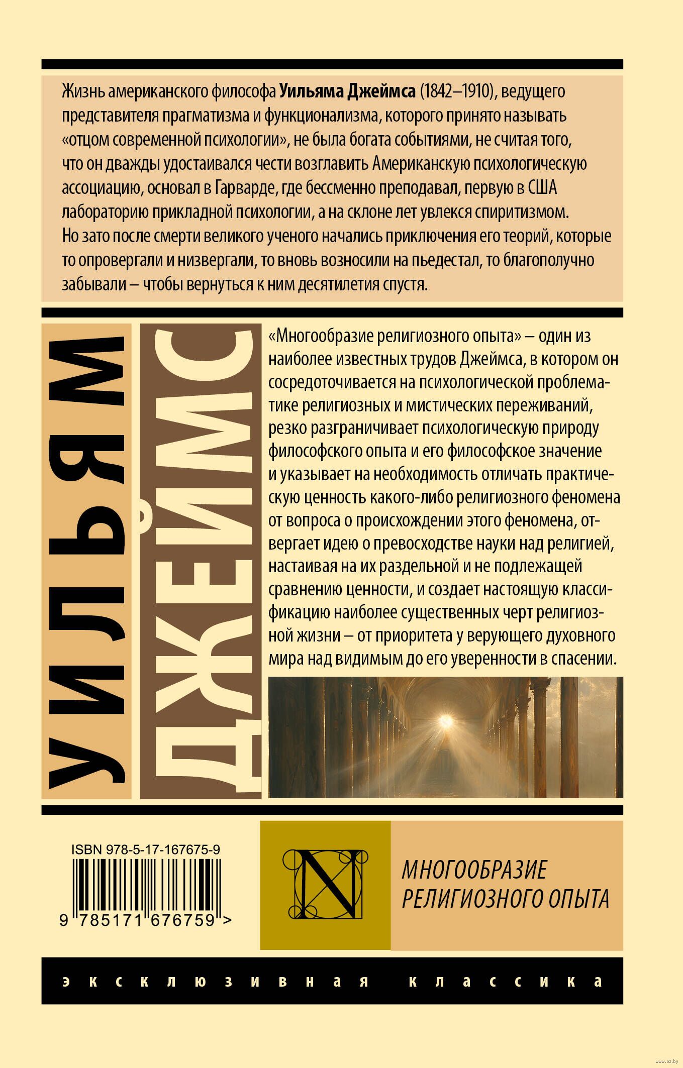 "Многообразие религиозного опыта" – один из наиболее известных трудов Джеймса, в котором он сосредоточивается на психологической проблематике религиозных и мистических переживаний, резко разграничивает психологическую природу философского опыта и его философское значение и указывает на необходимость отличать практическую ценность какого-либо религиозного феномена от вопроса о происхождении этого феномена, отвергает идею о превосходстве науки над религией, настаивая на их раздельной и не подлежащей сравнению ценности, и создает настоящую классификацию наиболее существенных черт религиозной жизни – от приоритета у верующего духовного мира над видимым до его уверенности в спасении.