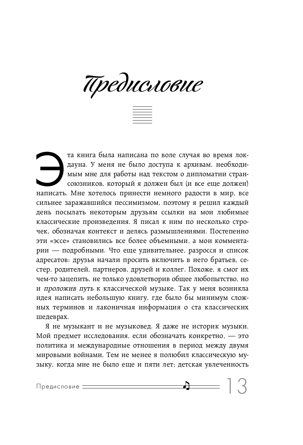 Классическая музыка способна дарить человеку всю гамму эмоций, которую только можно испытать, а также может стать идеальным фоном практически для любого события в жизни. Внутри этой книги собраны сто потрясающих классических мелодий Баха, Бетховена, Шопена, Моцарта и других. Истории создания шедевров и рекомендации по лучшим записям этих мелодий обеспечат плавное и в то же время полноценное погружение в мир классики.