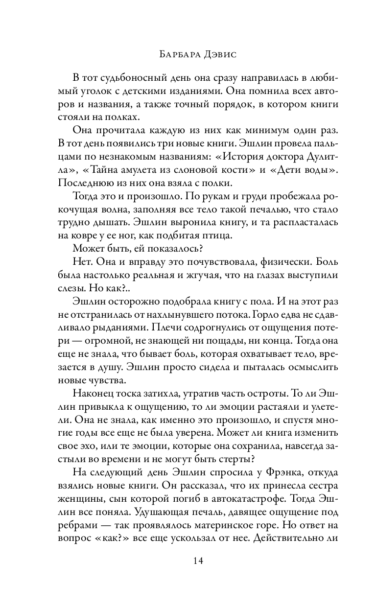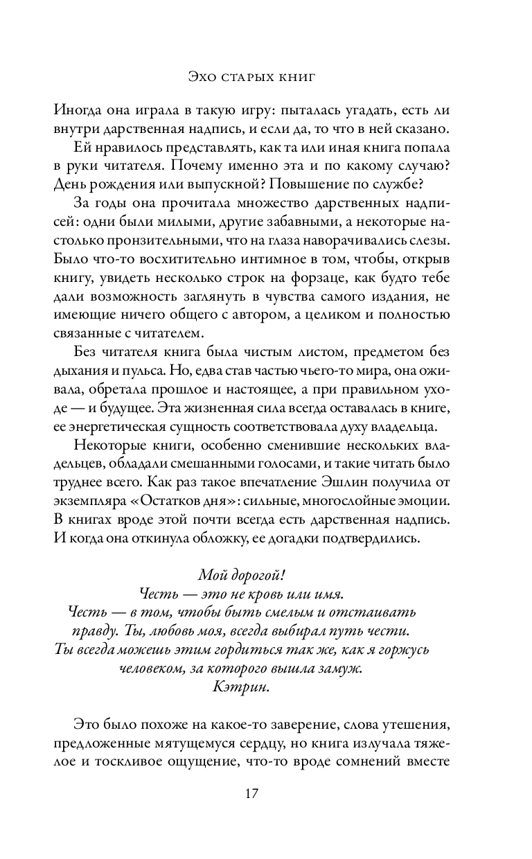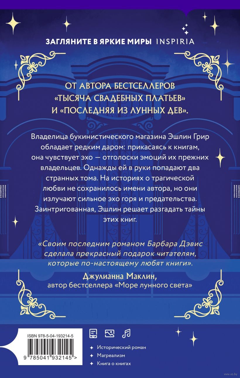 1984 год. Владелица букинистического магазина Эшлин Грир обладает редким даром: прикасаясь к книгам, она чувствует "эхо" – отголоски эмоций их прежних владельцев. Однажды ей в руки попадают два странных тома, рассказывающих о трагической любви. Книги не имеют никаких выходных данных и даже имени автора. Они излучают сильное эхо горя и предательства. Заинтригованная Эшлин решает попытаться разгадать тайну появления этих книг на свет.