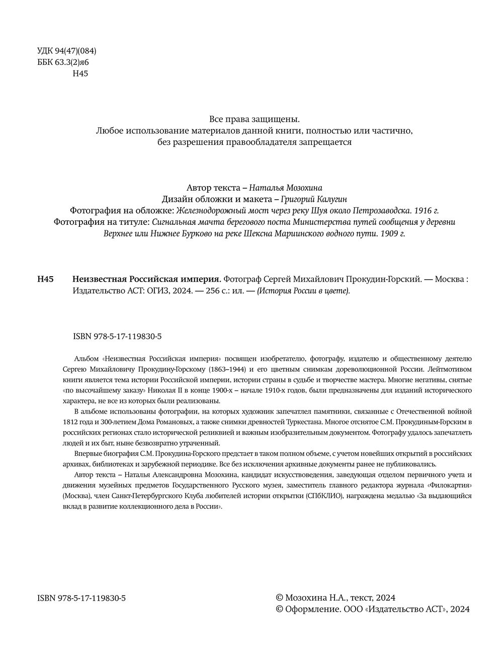 Альбом "Неизвестная Российская империя" посвящен изобретателю, фотографу, издателю и общественному деятелю Сергею Михайловичу Прокудину-Горскому (1863-1944) и его цветным снимкам дореволюционной России. Лейтмотивом книги является тема истории Российской империи, истории страны в судьбе и творчестве мастера. Многие негативы, снятые "по высочайшему заказу" Николая II в конце 1900-х – начале 1910-х годов, были предназначены для изданий исторического характера, не все из которых были реализованы.