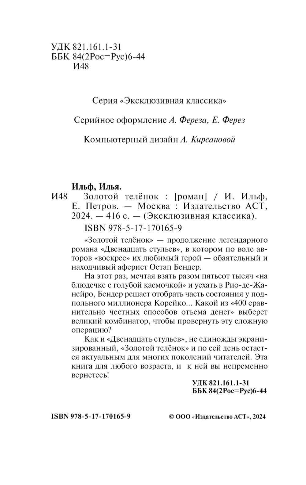 "Золотой телёнок" – продолжение легендарного романа "Двенадцать стульев", в котором по воле авторов «воскрес» их любимый герой – обаятельный и находчивый аферист Остап Бендер.