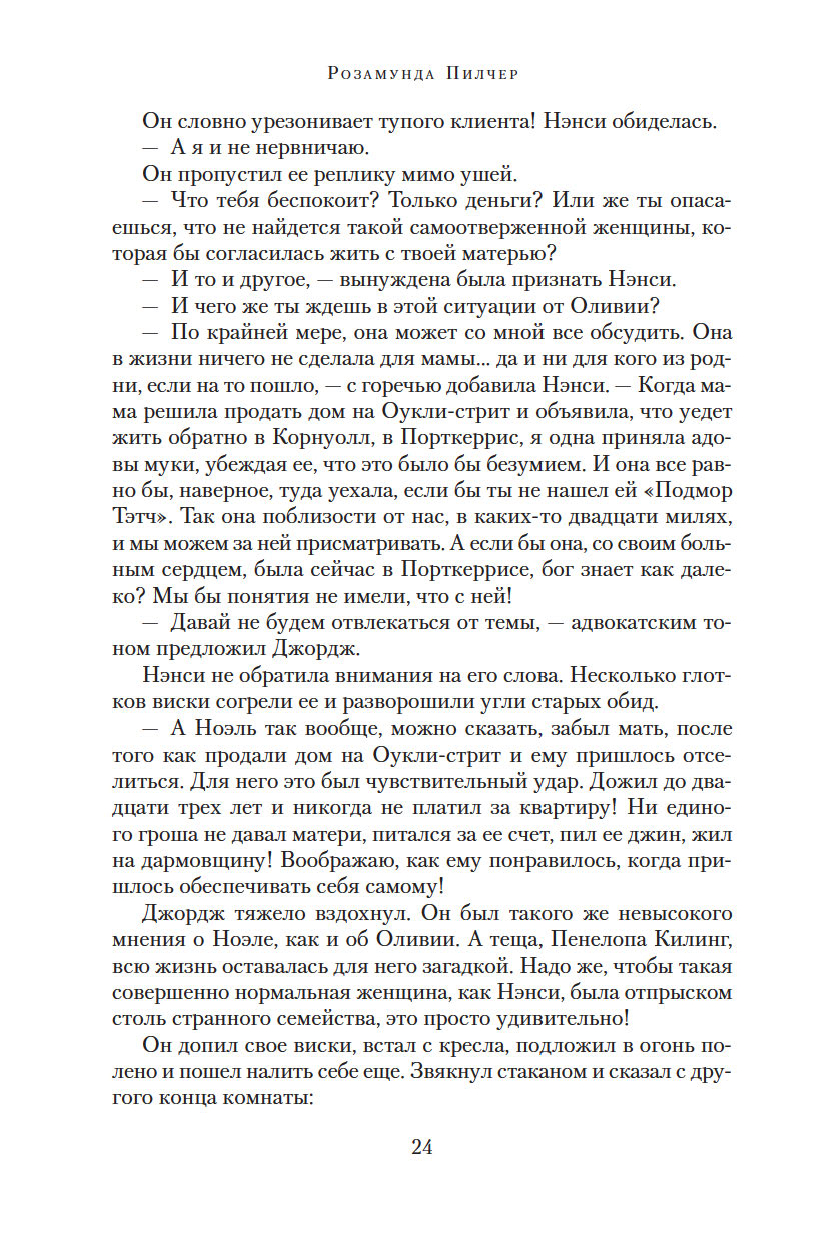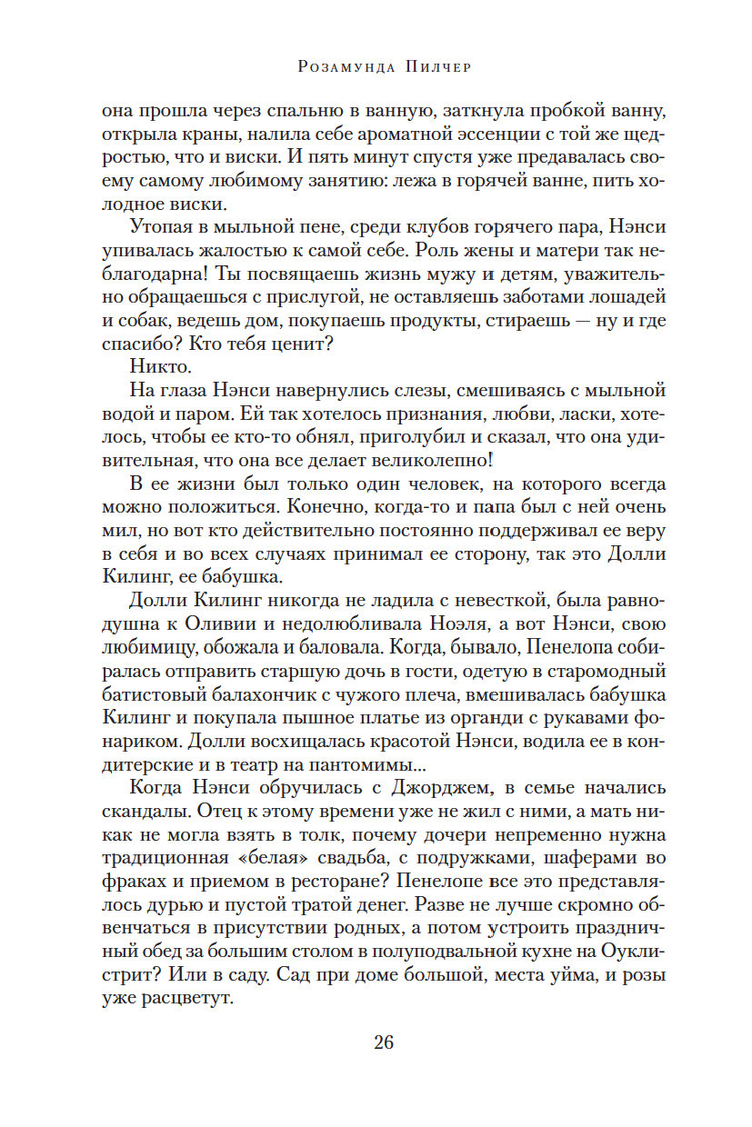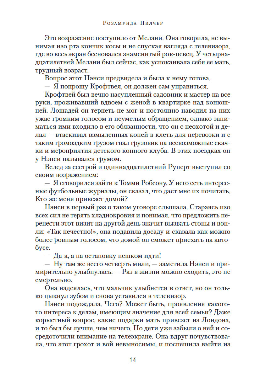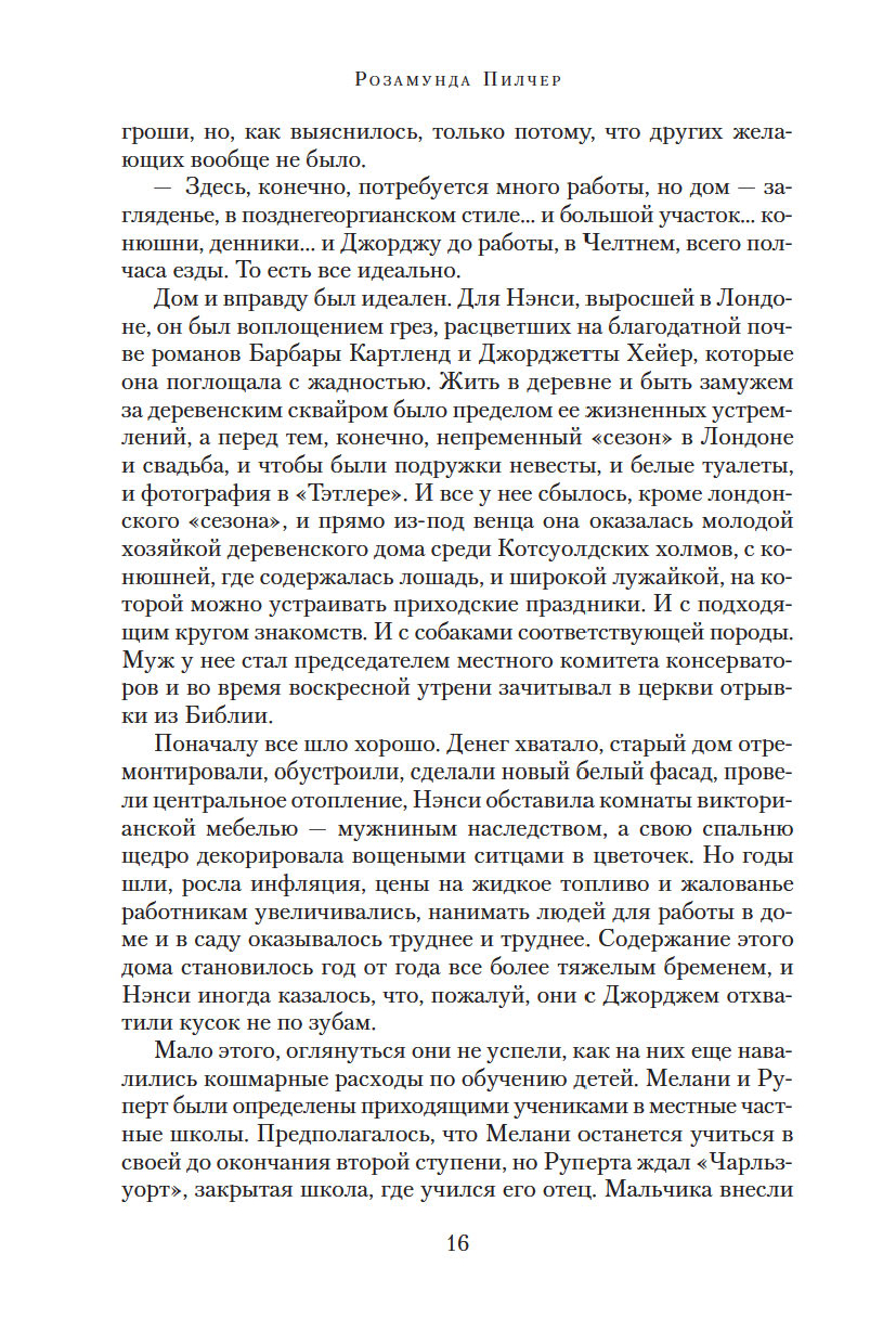 Жизнь трех поколений английской семьи – война и мир, лирика и драма, искушение и катарсис – проходит перед глазами читателей. Яркий, атмосферный роман, написанный Розамундой Пилчер, имел феноменальный успех и сразу же принес автору мировую известность. Большинство ее произведений экранизировано, а общий тираж книг писательницы перевалил за 60 миллионов экземпляров.