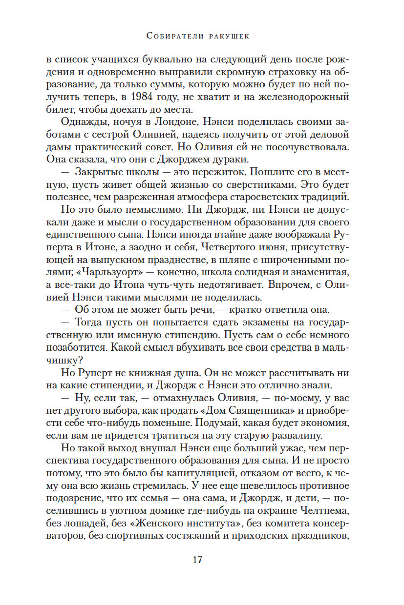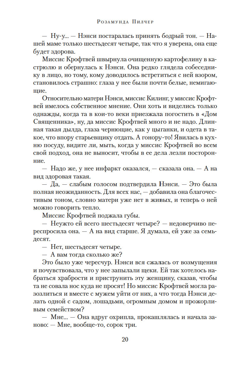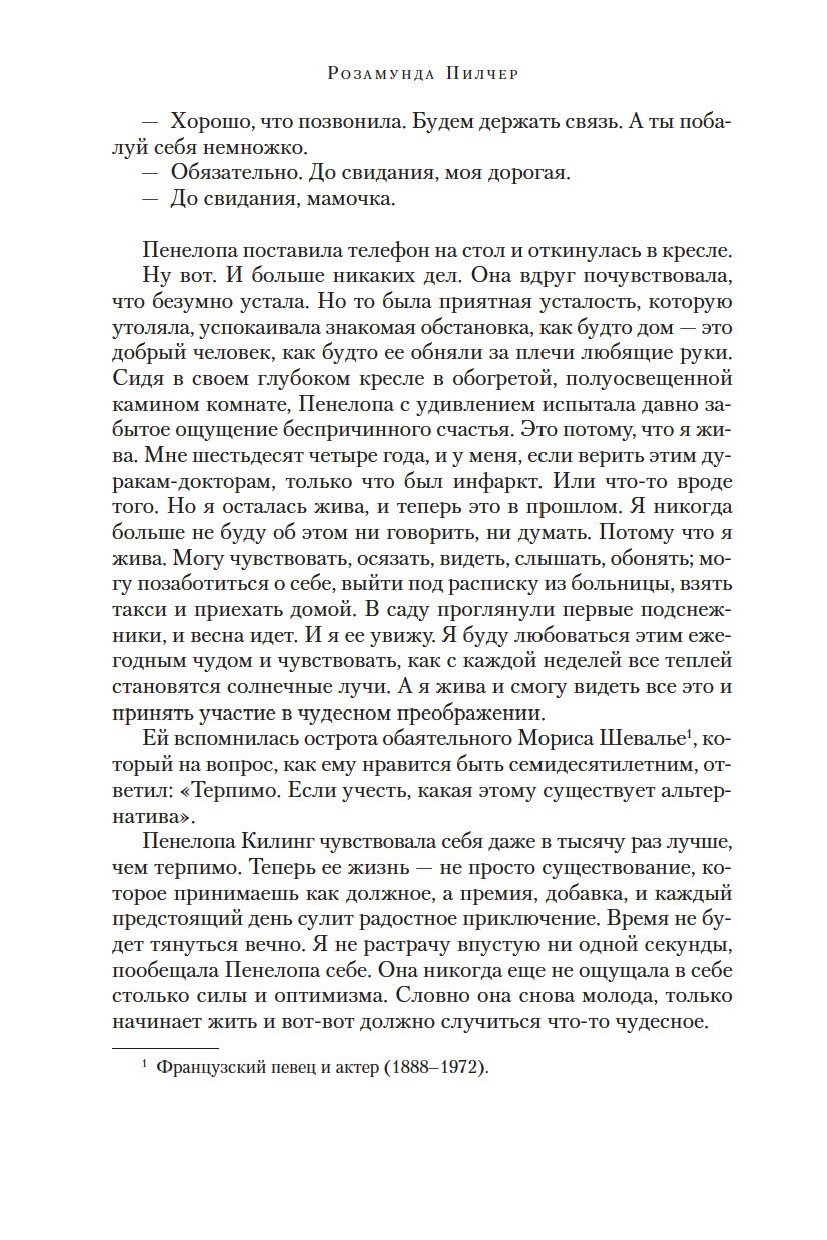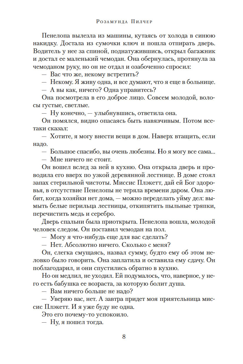 Жизнь трех поколений английской семьи – война и мир, лирика и драма, искушение и катарсис – проходит перед глазами читателей. Яркий, атмосферный роман, написанный Розамундой Пилчер, имел феноменальный успех и сразу же принес автору мировую известность. Большинство ее произведений экранизировано, а общий тираж книг писательницы перевалил за 60 миллионов экземпляров.