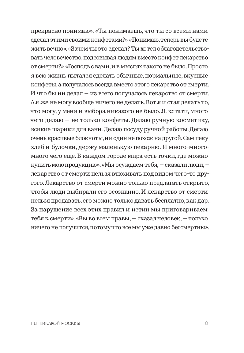 В сборнике короткой прозы Аллы Горбуновой действительно никакой Москвы нет. Есть инопланетный котенок, преподавательница философии, рабочий-мигрант, неизвестная светящаяся субстанция, сотрудники салона сотовой связи, лешие и кикиморы. И идея, которая объединяет все произведения сборника, – идея движения прочь от постижимого мира к новым мыслям и состояниям, к дружбе с непохожим и чуждым. Будет странно, печально и радостно.