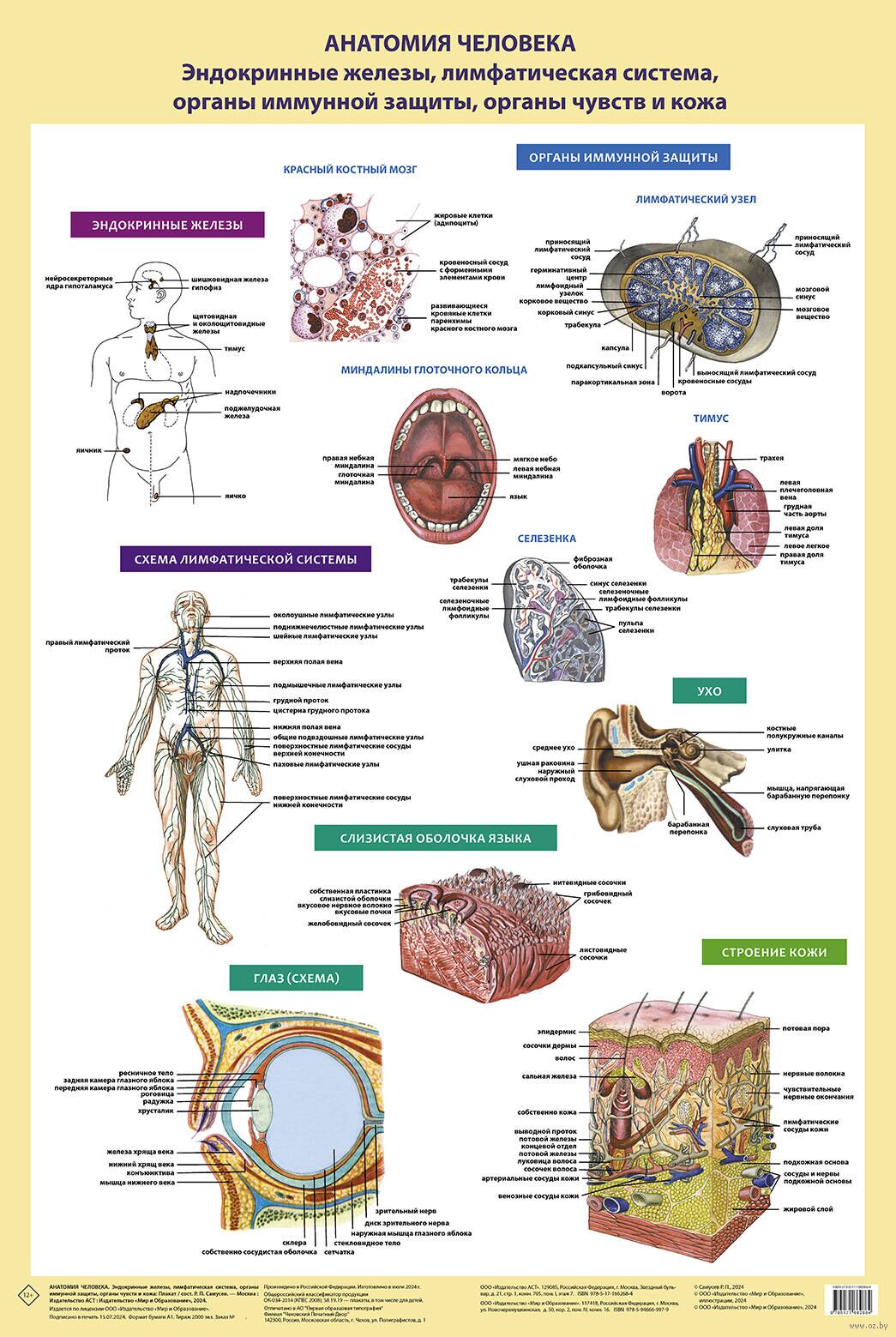 На плакате представлены системы человеческого организма: эндокринные железы, лимфатическая система, органы иммунной защиты, органы чувств и кожа. От автора известных учебных пособий и атласов анатомии Р.П. Самусева. Подойдёт для широкого круга читателей: школьников, студентов высших учебных заведений, художников и т.д. Простая терминология, понятные обозначения. Карта упакована в прозрачный рукав из мягкого пластика.
