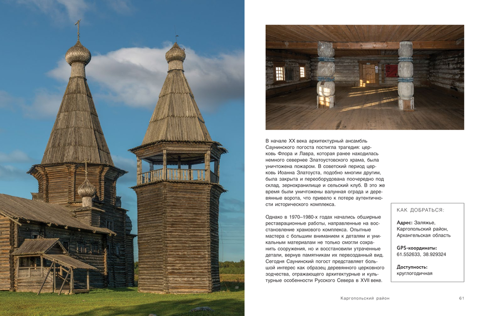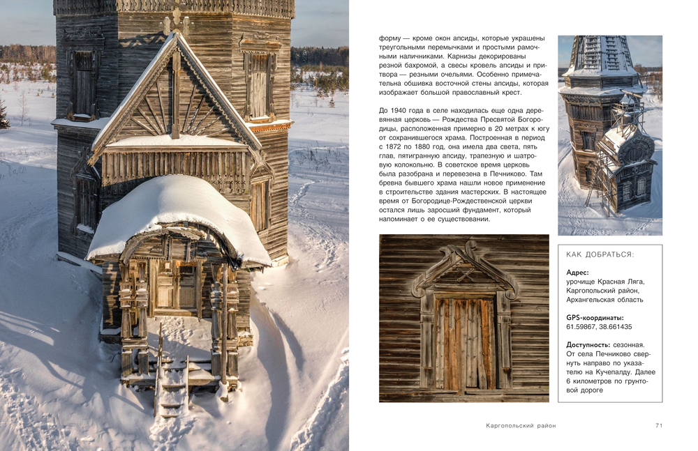 Издание познакомит вас с интересными памятниками северной архитектуры: яркая и самобытная домовая роспись, усадебные дома, хранящие следы былой роскоши, и ансамбли тройники с кубоватыми и шатровыми церквями, возвышающиеся над землей словно великаны. Многие из представленных архитектурных жемчужин находятся в заброшенном или законсервированном состоянии, но от этого они не теряют свое очарование и значимость.