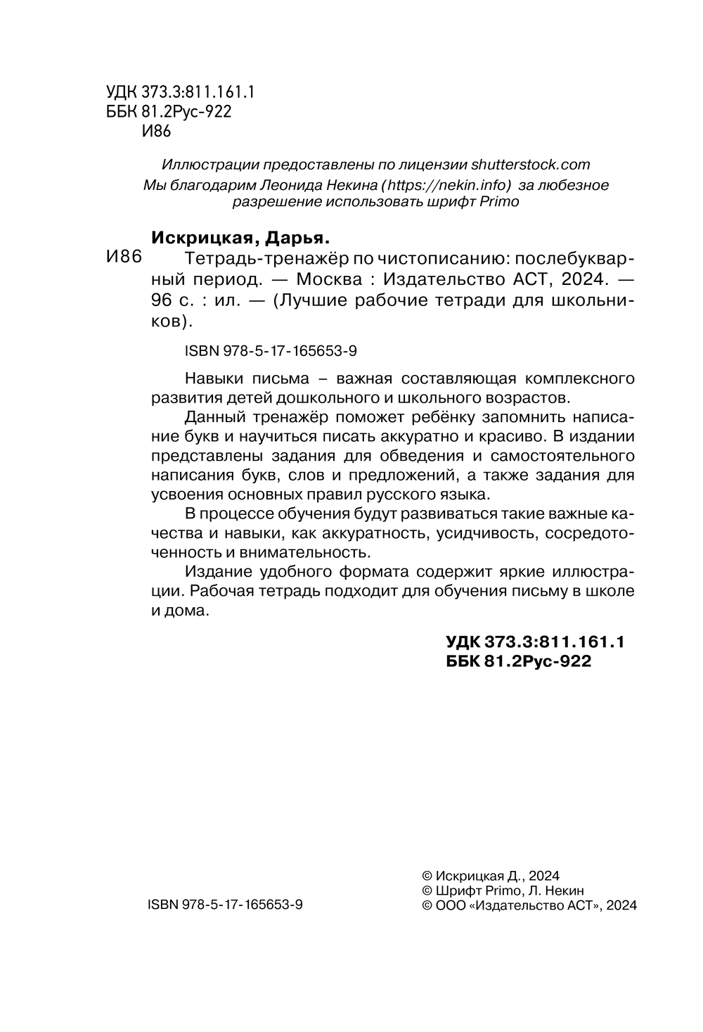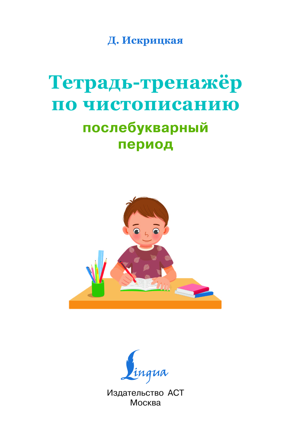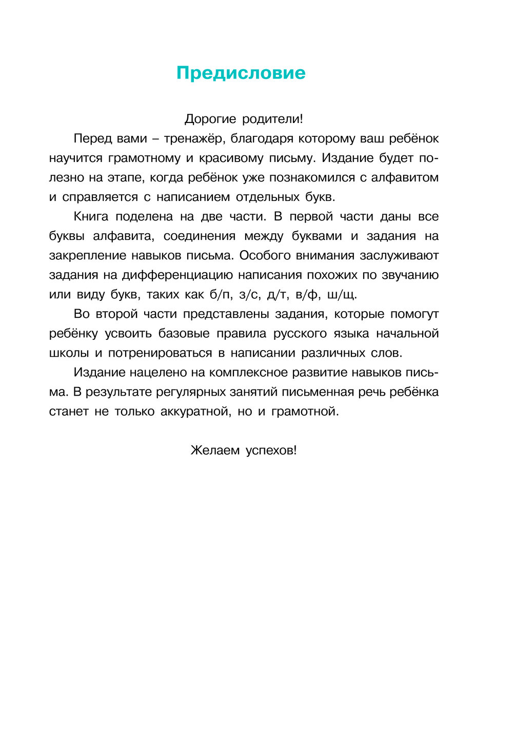 Данный тренажёр поможет ребёнку запомнить написание букв и научиться писать аккуратно и красиво. В издании представлены задания для обведения и самостоятельного написания букв, слов и предложений, а также задания для усвоения основных правил русского языка.