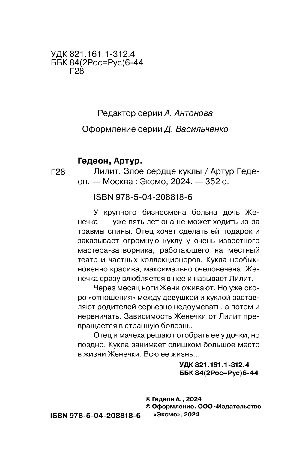 У крупного бизнесмена больна дочь Женечка – уже пять лет она не может ходить из-за травмы спины. Отец хочет сделать ей подарок и заказывает огромную куклу у очень известного мастера-затворника, работающего на местный театр и частных коллекционеров. Кукла необыкновенно красива, максимально очеловечена. Женечка сразу влюбляется в нее и называет Лилит.