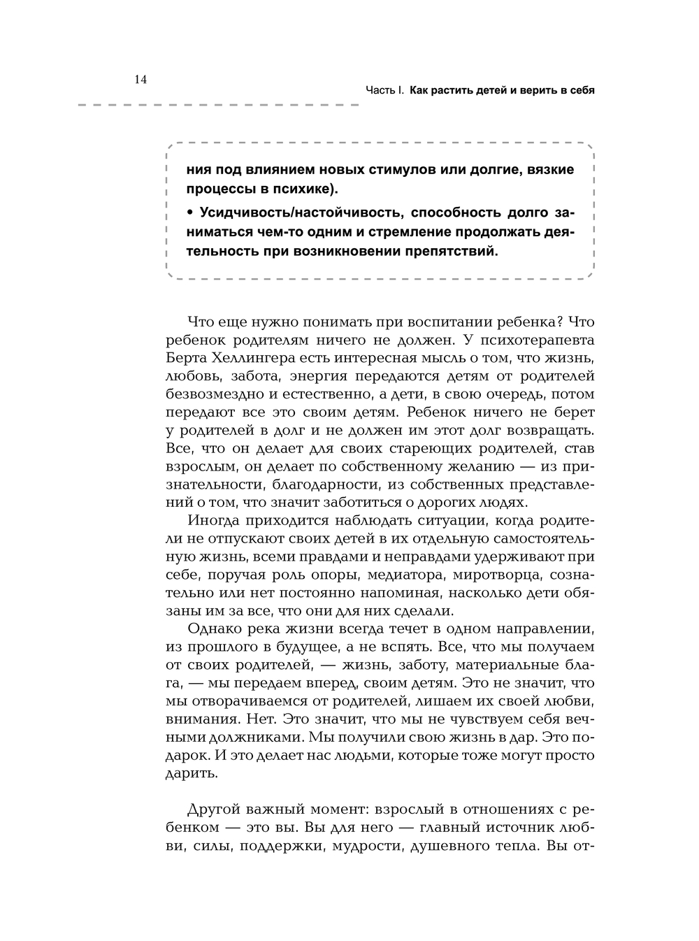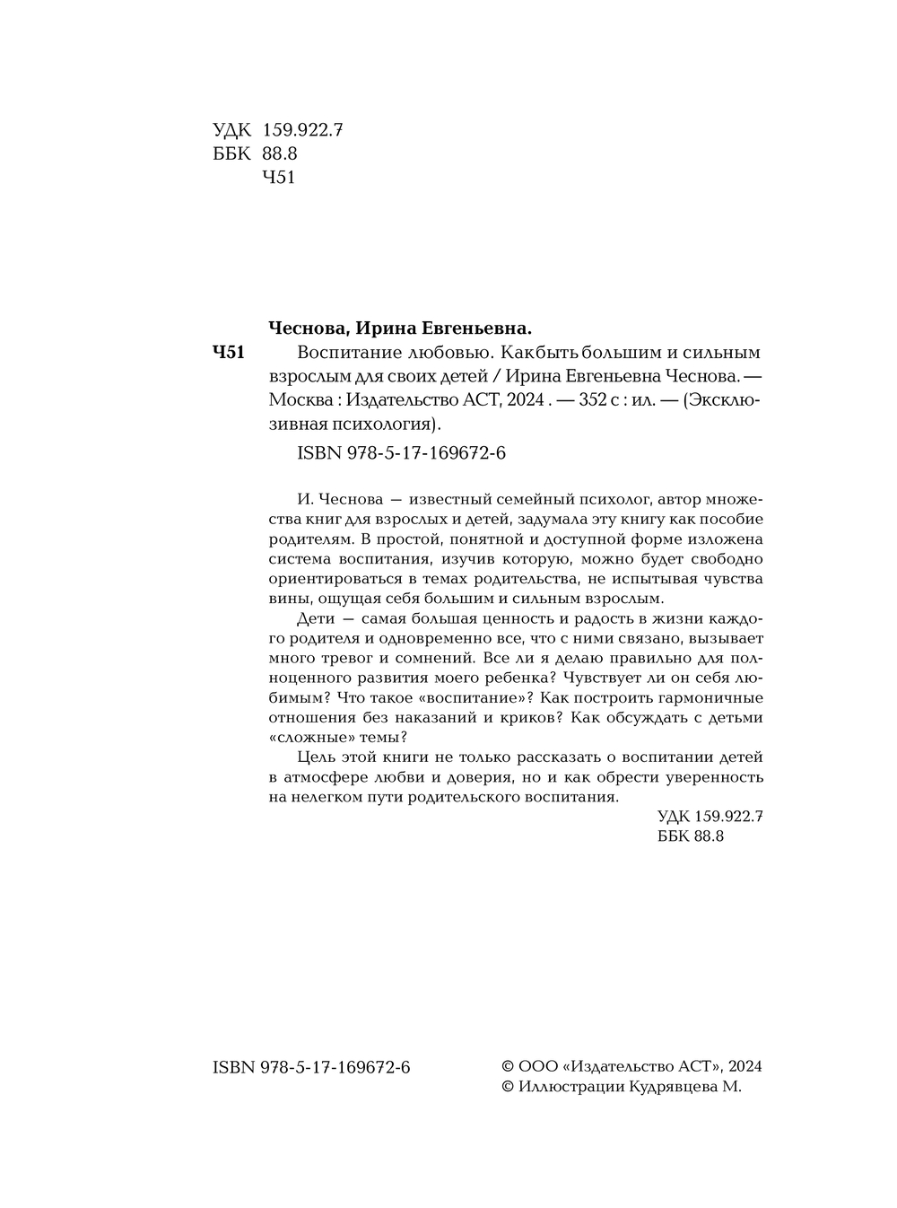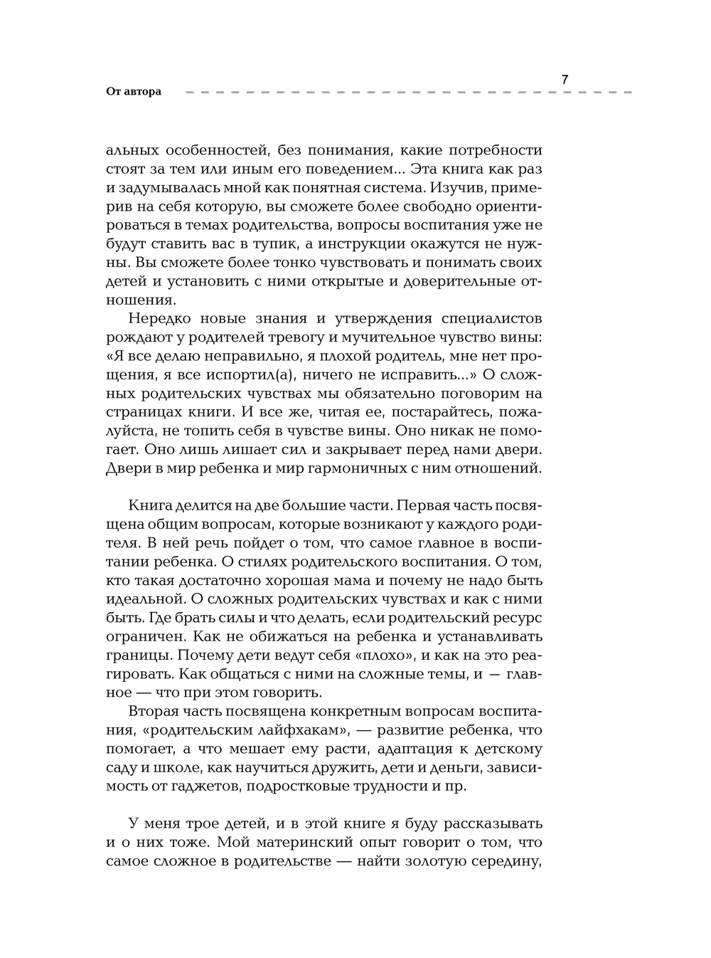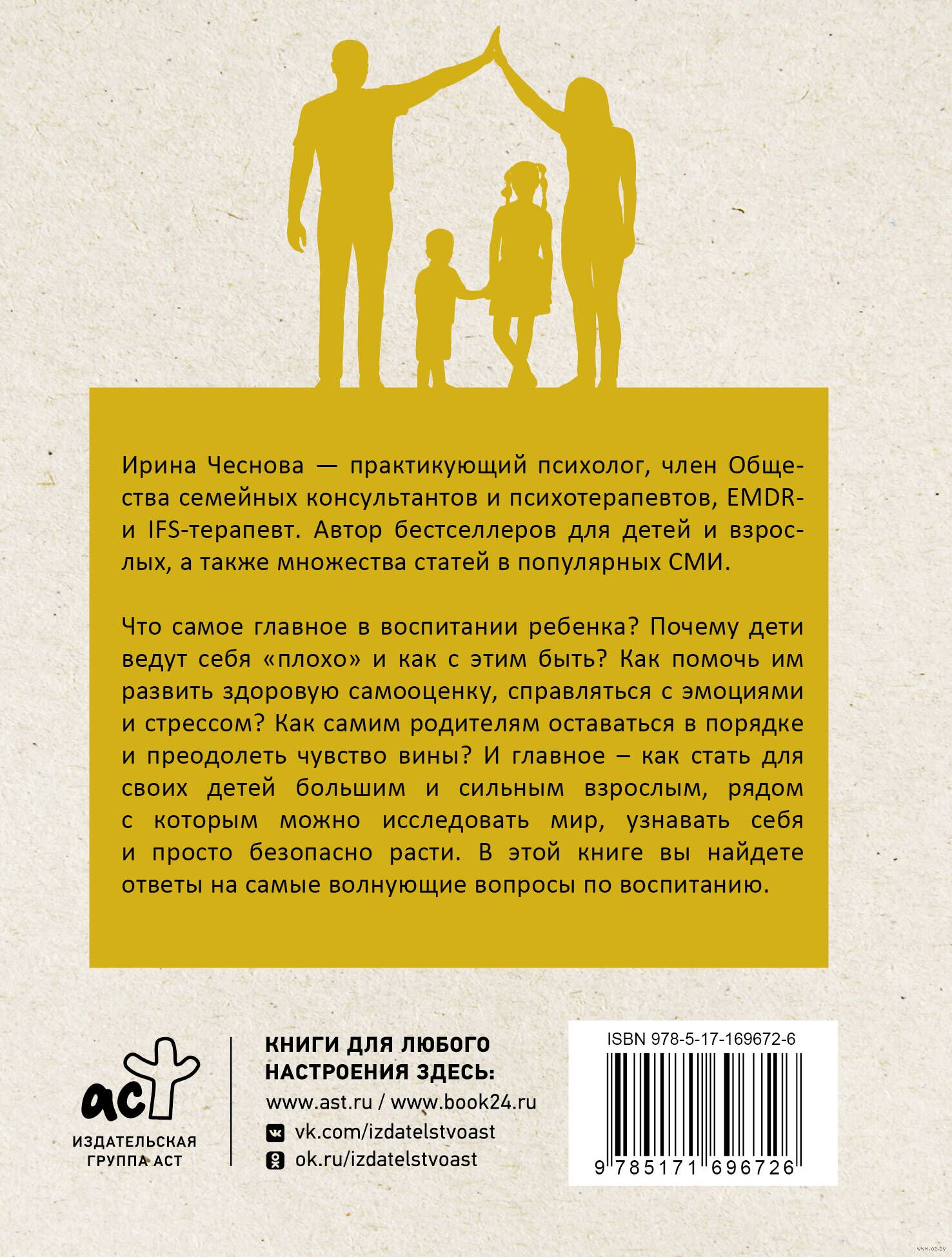 И. Чеснова – известный семейный психолог, автор множества книг для взрослых и детей, задумала эту книгу как пособие родителям. В простой, понятной и доступной форме изложена система воспитания, изучив которую, можно будет свободно ориентироваться в темах родительства, не испытывая чувства вины, ощущая себя большим и сильным взрослым. Дети – самая большая ценность и радость в жизни каждого родителя и одновременно все, что с ними связано, вызывает много тревог и сомнений. Все ли я делаю правильно для полноценного развития моего ребенка? Чувствует ли он себя любимым? Что такое "воспитание"? Как построить гармоничные отношения без наказаний и криков? Как обсуждать с детьми "сложные" темы?