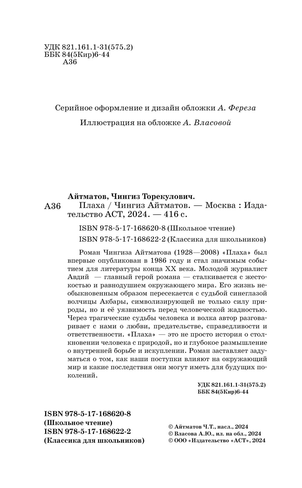 Роман Чингиза Айтматова (1928-2008 гг.) "Плаха" был впервые опубликован в 1986 году и стал значимым событием для литературы конца ХХ века. Молодой журналист Авдий – главный герой романа – сталкивается с жестокостью и равнодушием окружающего мира. Его жизнь необыкновенным образом пересекается с судьбой синеглазой волчицы Акбары, символизирующей не только силу природы, но и её уязвимость перед человеческой жадностью. Через трагические судьбы человека и волка автор разговаривает с нами о любви, предательстве, справедливости и ответственности. "Плаха" – это не просто история о столкновении человека с природой, но и глубокое размышление о внутренней борьбе и искуплении.