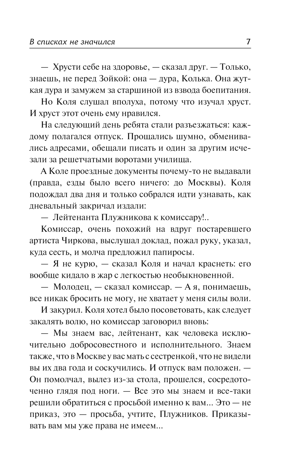 "В списках не значился" – одна из самых известных повестей Бориса Васильева. Это история о первых днях войны, об обороне легендарной Брестской крепости и, конечно, о людях, вставших на защиту Родины. Главный герой – лейтенант Плужников, сражавшийся с фашистами до последнего вздоха, – это символ всех неизвестных, "безымянных" солдат, самоотверженно воевавших с немецкими захватчиками.