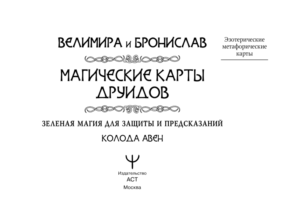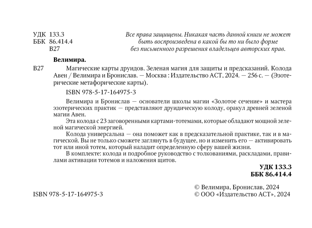 Велимира и Бронислав, основатели школы магии "Золотое сечение" и эксперты в эзотерических практиках, представляют колоду карт оракула Авен, основанную на древней друидической магии. Эта колода состоит из 23 заговоренных карт-тотемов, наполненных мощной зеленой магической энергией. Колода универсальна и подходит как для предсказаний, так и для магических практик. С ее помощью вы сможете не только заглянуть в будущее, но и изменить его, активируя тотем, который поможет улучшить определенные аспекты вашей жизни. В комплект входят колода карт и подробное руководство с толкованиями, раскладами и инструкциями по активации тотемов и наложению защитных щитов.