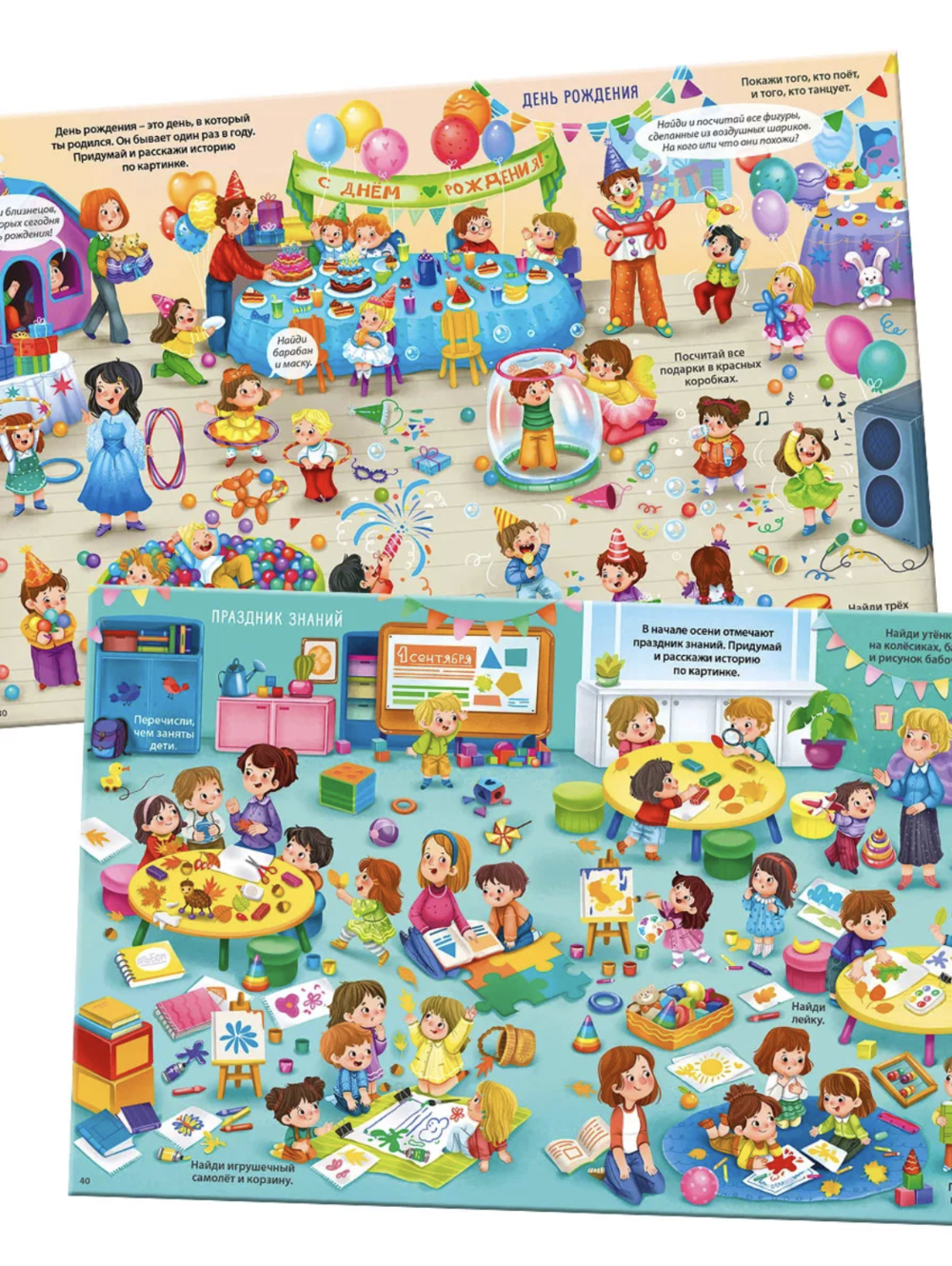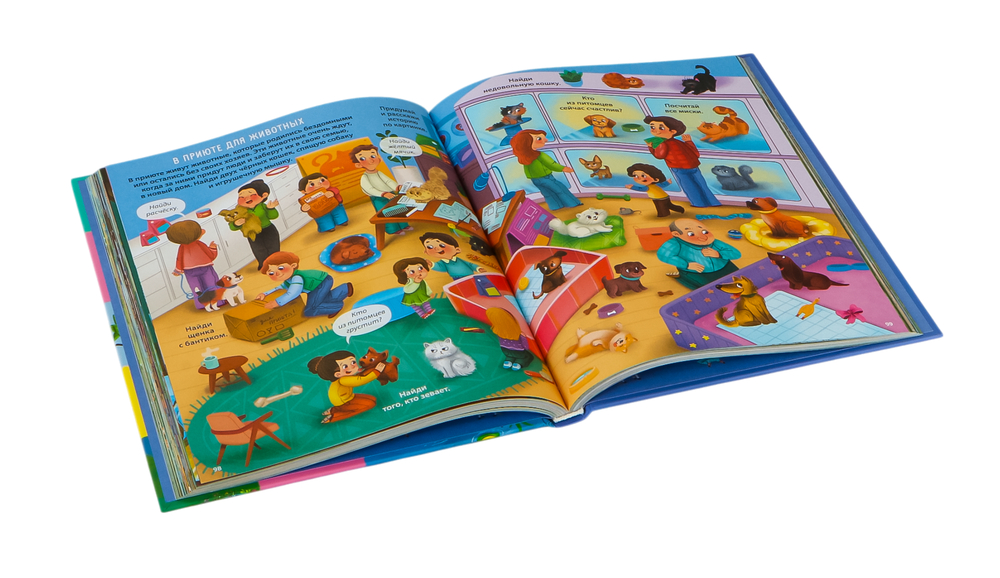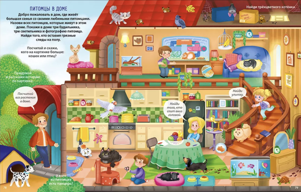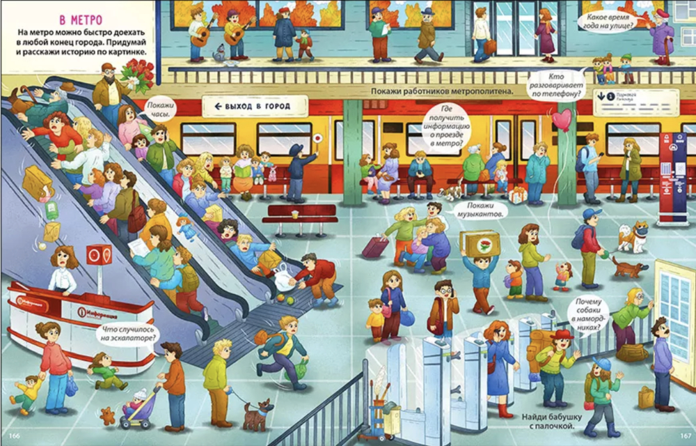 Начинать разглядывать картинки виммельбуха можно уже с года. А с трёх лет ребёнку будет интересно с ним играть и выполнять задания.